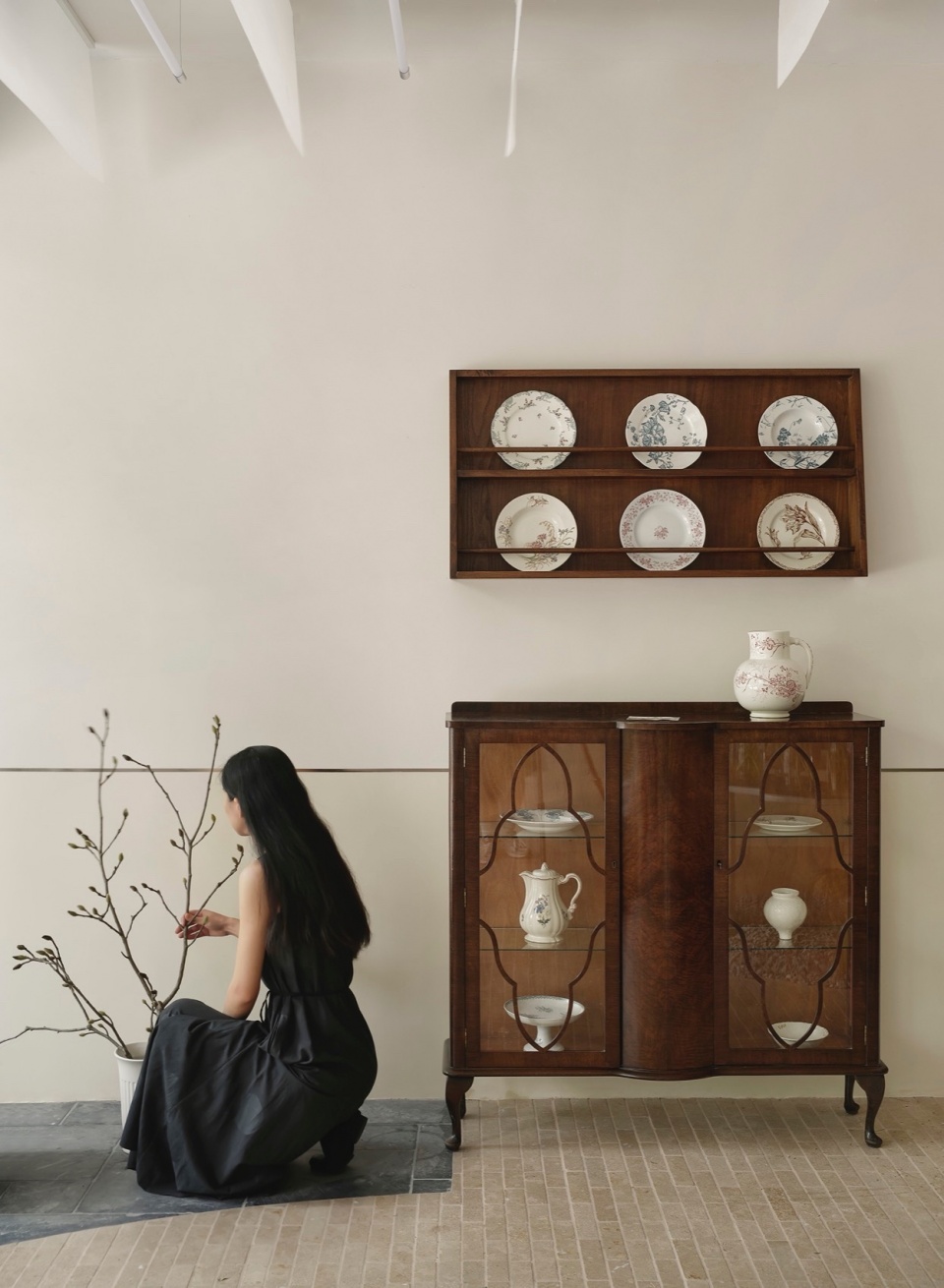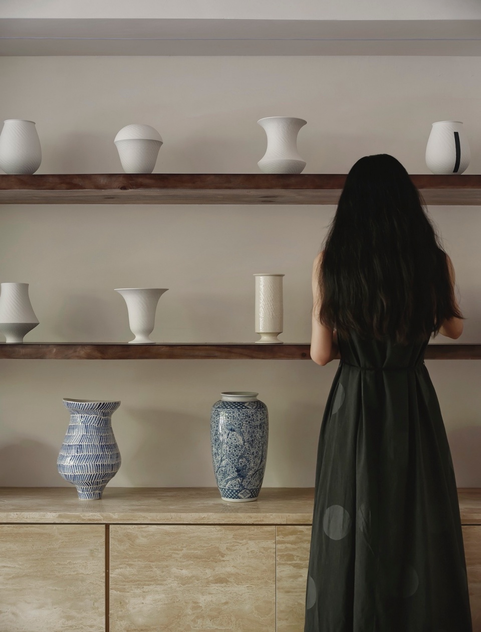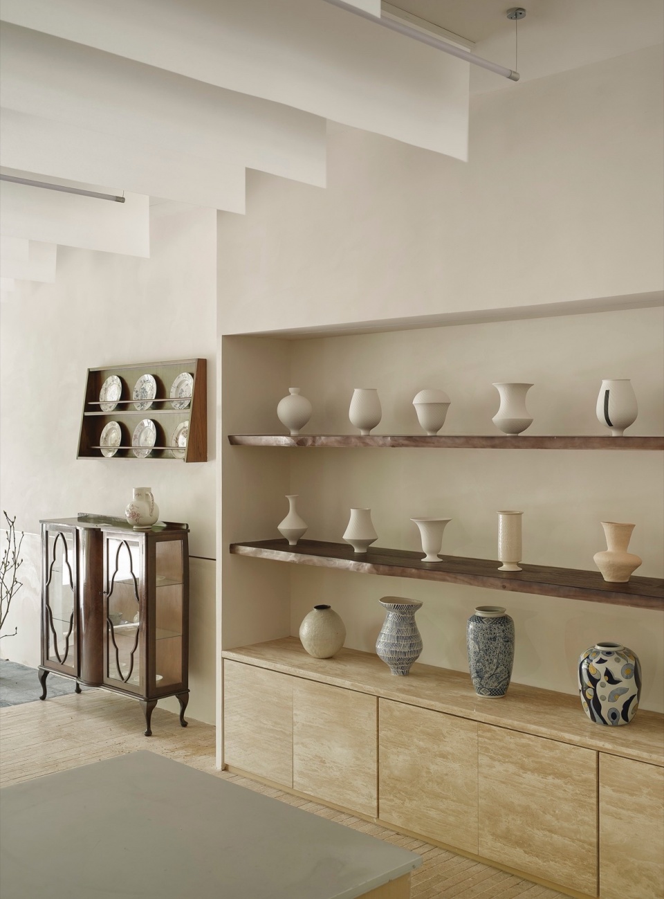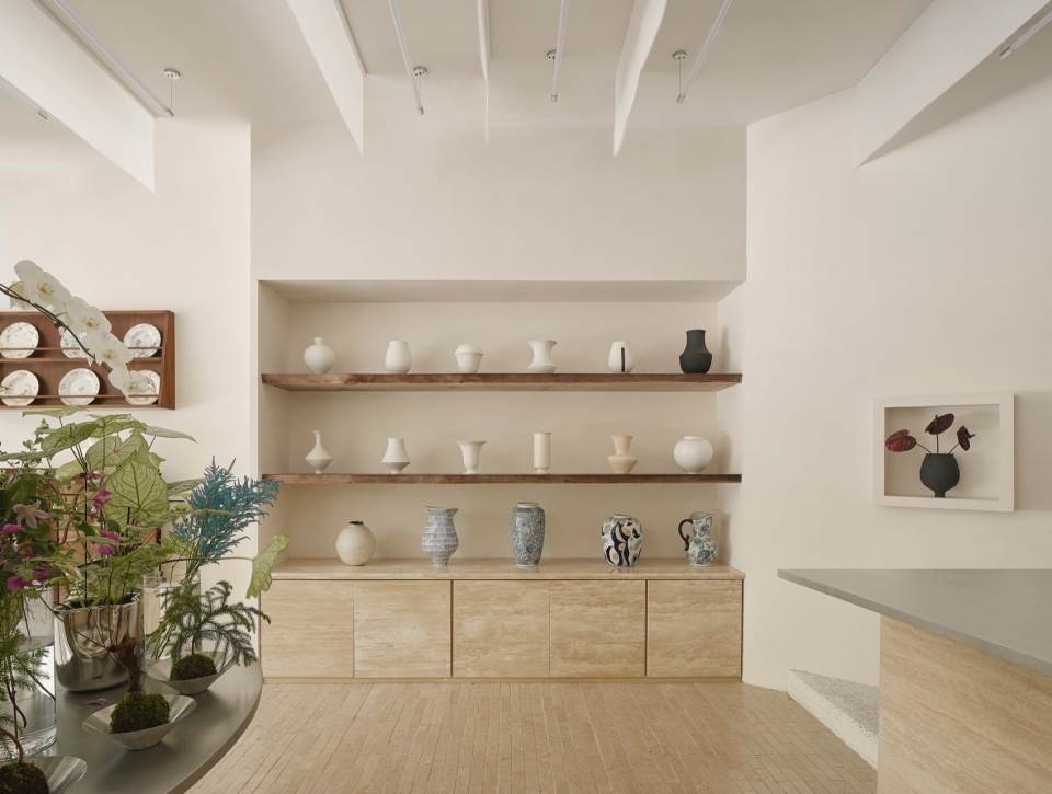 Mirrors are placed on both sides of the space. The mirrors enhance the visual extension of the space while providing different perspectives for displaying floral arrangements. The shelving area on the left uses old wood for the shelves, with the cabinet doors at the bottom continuing the travertine material, echoing the floor and creating a harmonious visual effect throughout the space.