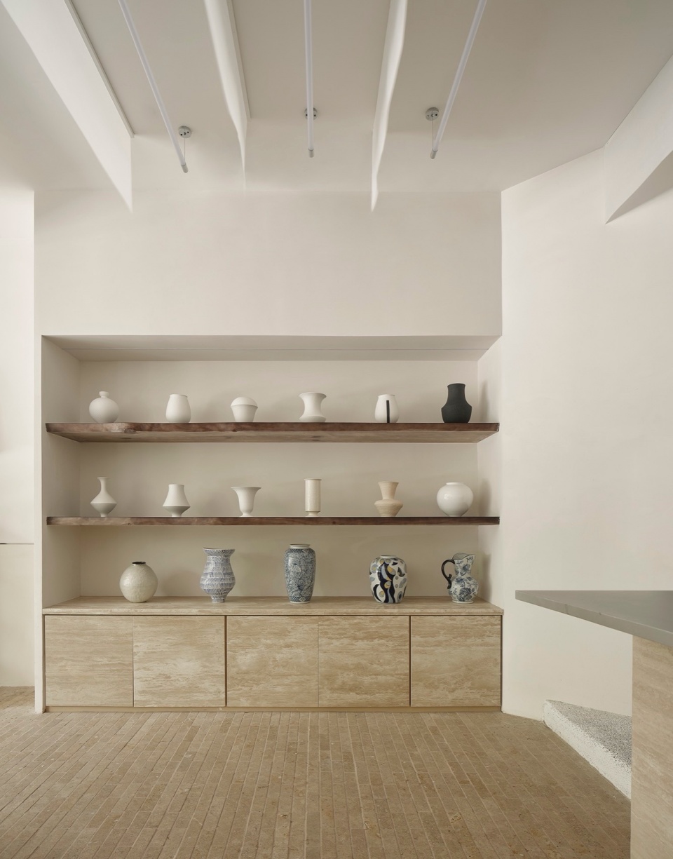 The flow of the space revolves around the central oval display. The floor is made of two types of handmade lime bricks. The gray stone naturally connects with the outdoor environment, while the beige stone, with its smaller size and woven arrangement, showcases a unique handcrafted natural texture and guides the movement of customers.
