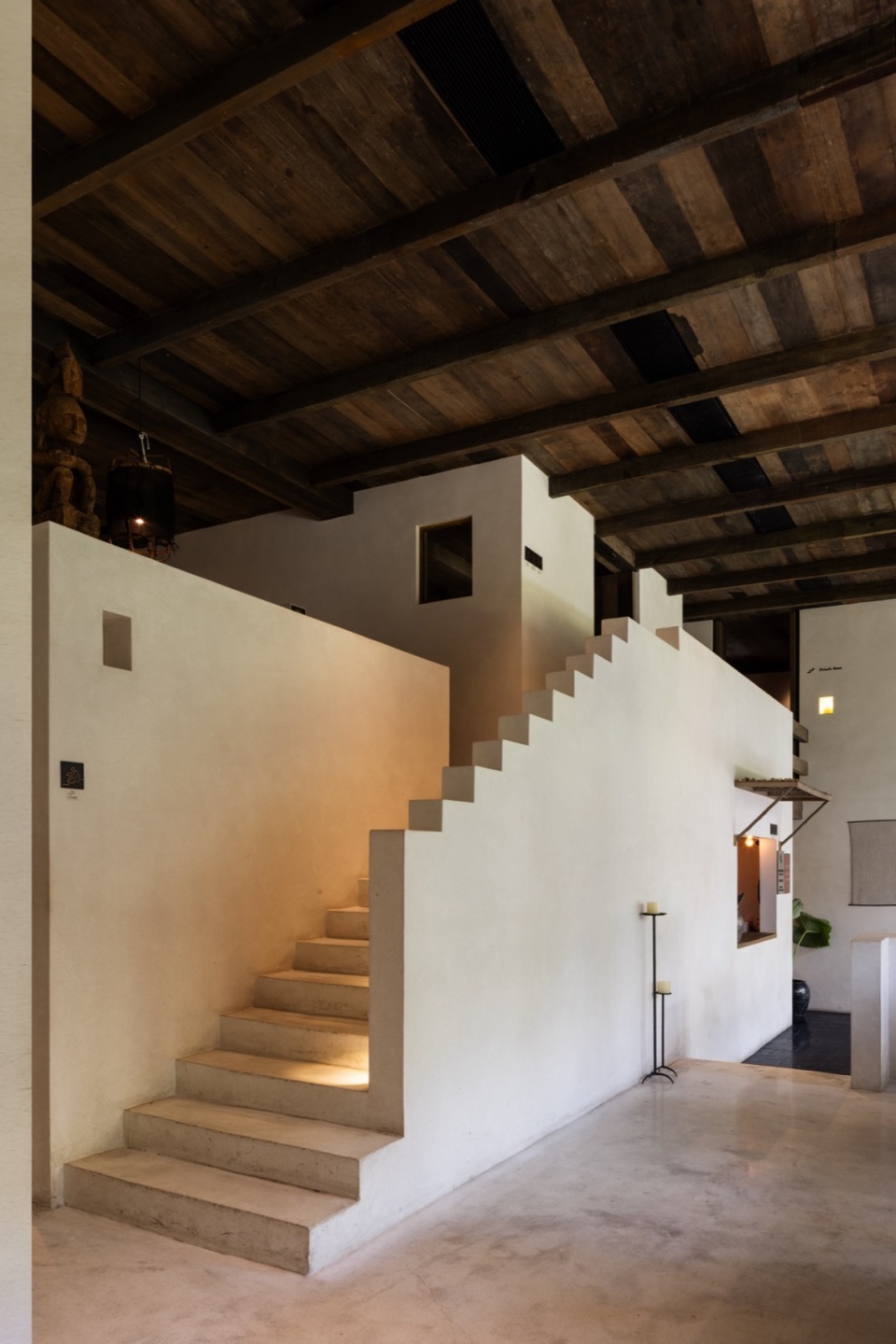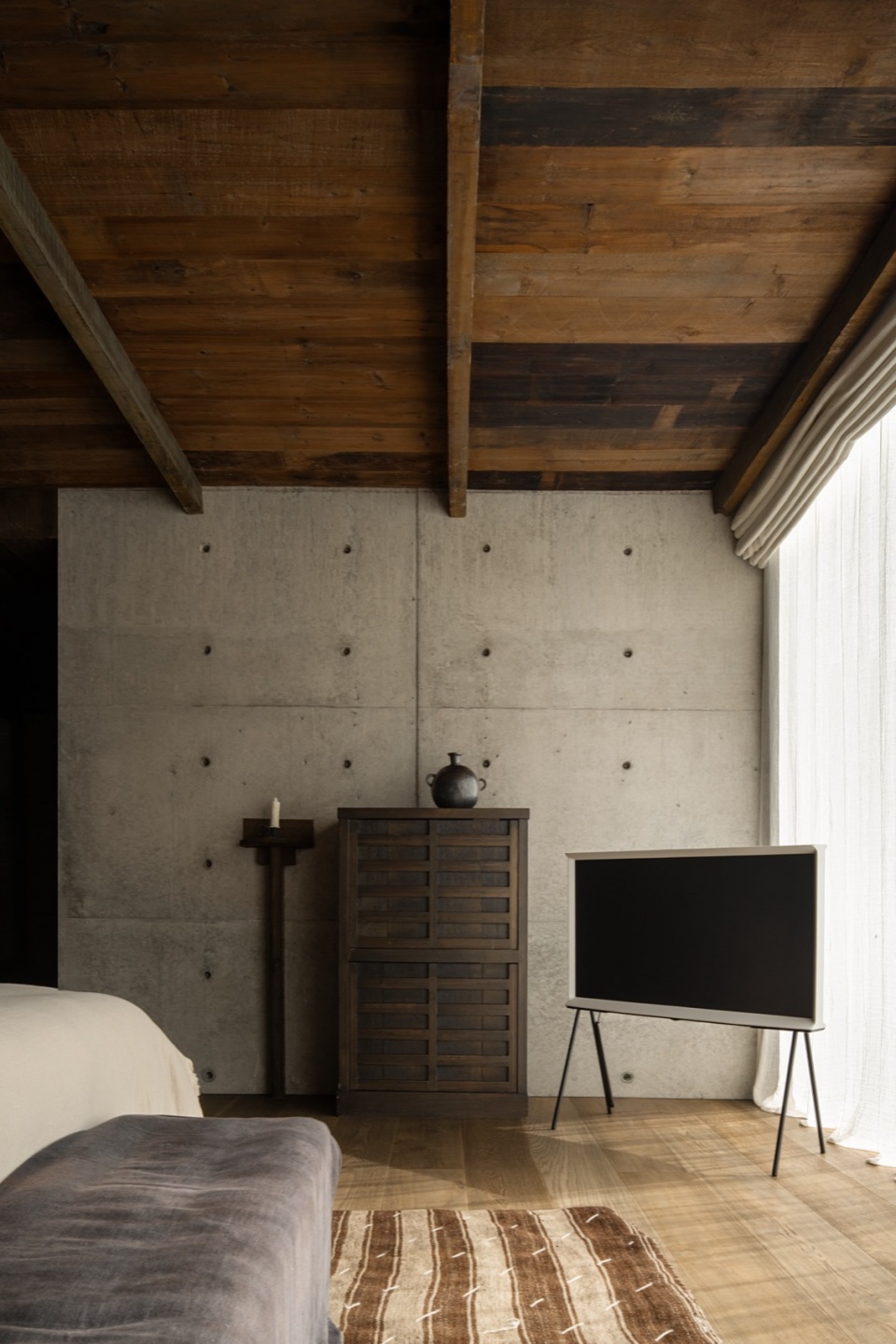 Inside, the raw concrete walls are preserved, and natural light is introduced through skylights, establishing a tranquil and organic atmosphere. As the light changes, it causes the space’s color tones, textures, surfaces, and perceptions to transform accordingly. The application of colors inspired by plants embodies the idea of “nature’s palette”. The interior design integrates local stones, reclaimed old wood, and other natural elements, complemented by linen bedding and vintage furniture, harmoniously blending light with air to create an ambiance that is both understated and sophisticated. Each room is equipped with a light well to improve lighting and ventilation. Expansive floor-to-ceiling windows draw the valley’s scenery into the room, crafting a serene sanctuary removed from the city’s hustle and bustle.