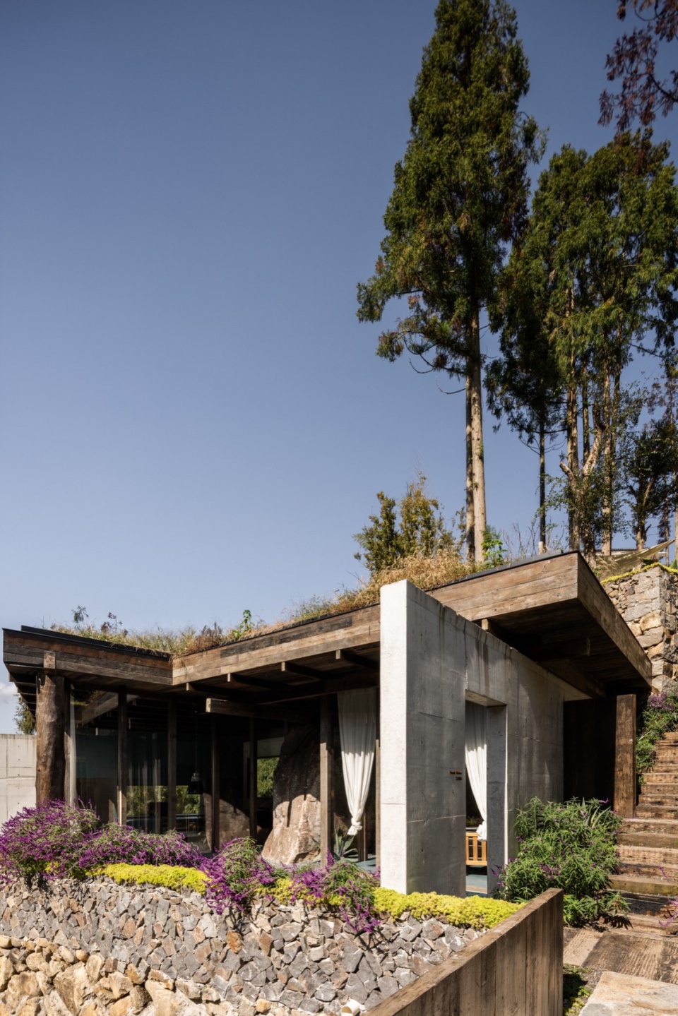 Embracing a brutalist architectural style, the building is covered with earth, appearing as though it has emerged from the ground, thus achieving a perfect harmony with nature. The guest rooms are situated along the stream, each featuring a private courtyard and a footbridge. Access to the rooms is gained by crossing the footbridge over the stream, and the courtyard’s lush vegetation offers guests a genuine experience of the changing seasons and temperatures.