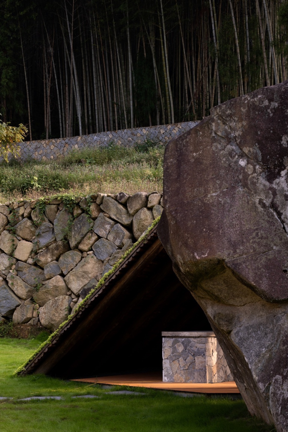 The large stone serves as the building’s visual anchor, functioning not only as the focal point but also as a structural element. Old wooden beams intersect and rest against the large stone, lending the space an air of sensibility and poetry. The roof, overgrown with wild grass, merges seamlessly with the surrounding valley. Large expanses of floor-to-ceiling glass on the building’s facade encircle the large stone, causing it to stand out like a piece of sculpture. This homage to the large stone imparts a unique ambiance to the building.