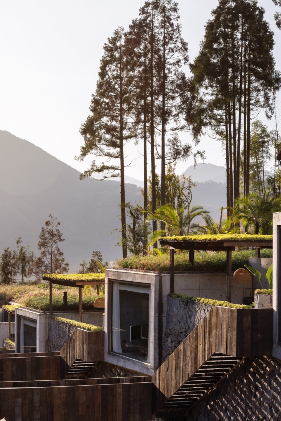 建筑采用粗野主义风格,以泥土覆盖,仿佛从土中生长,与自然完美融合。客房沿溪而建,每个房间配备独立庭院和天桥,需经溪上天桥进入,庭院植被茂盛,让人真切感受四季与温度变化。