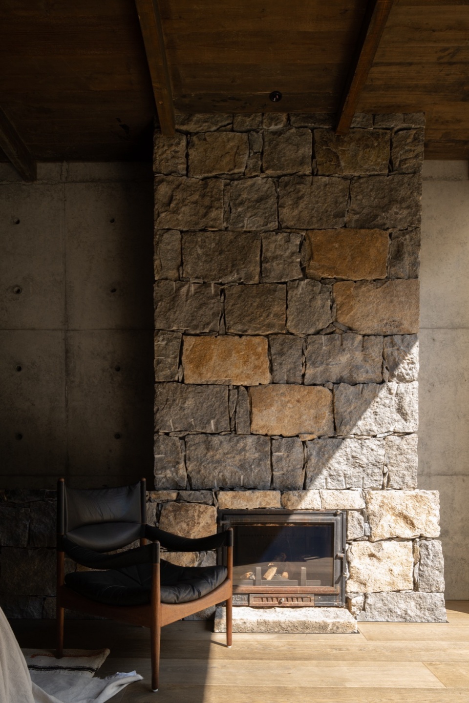 The large boulder is the centerpiece of the building, seamlessly merging with the natural surroundings and creating a scene reminiscent of a valley landscape. During winter, guests can gather around a bonfire in front of the stone, basking in warmth and a sense of abundance amidst the tranquil setting.
