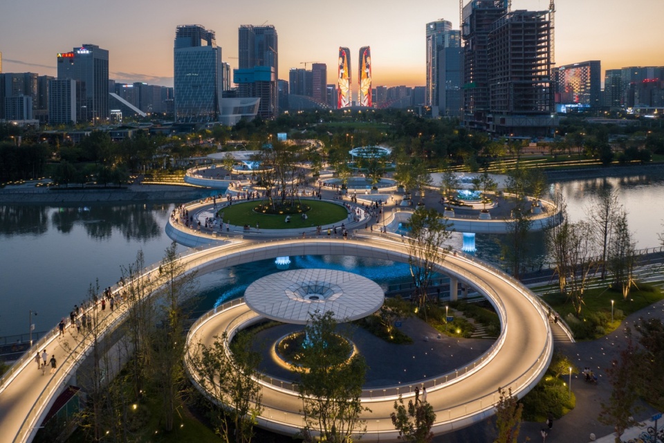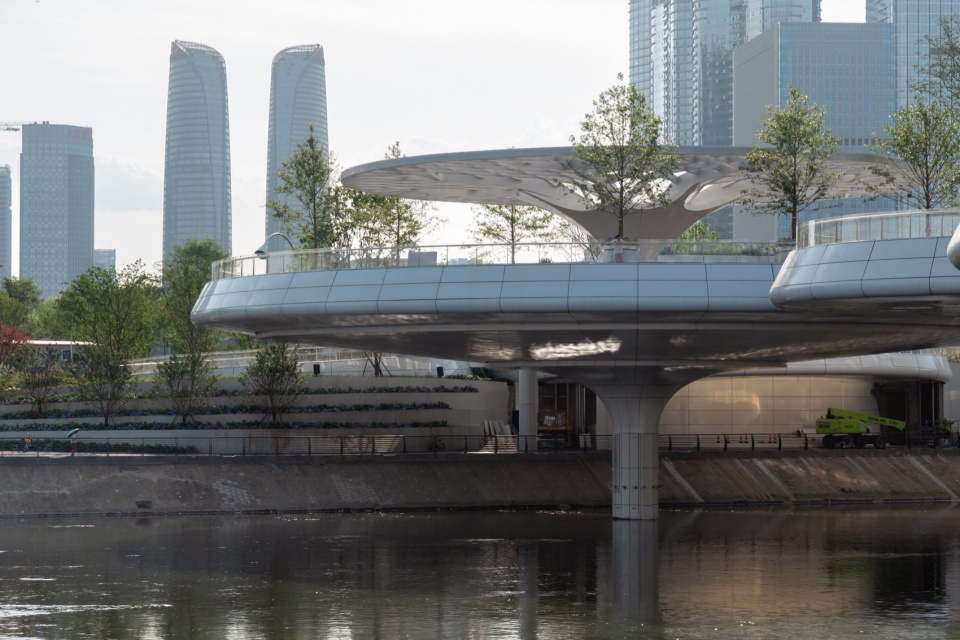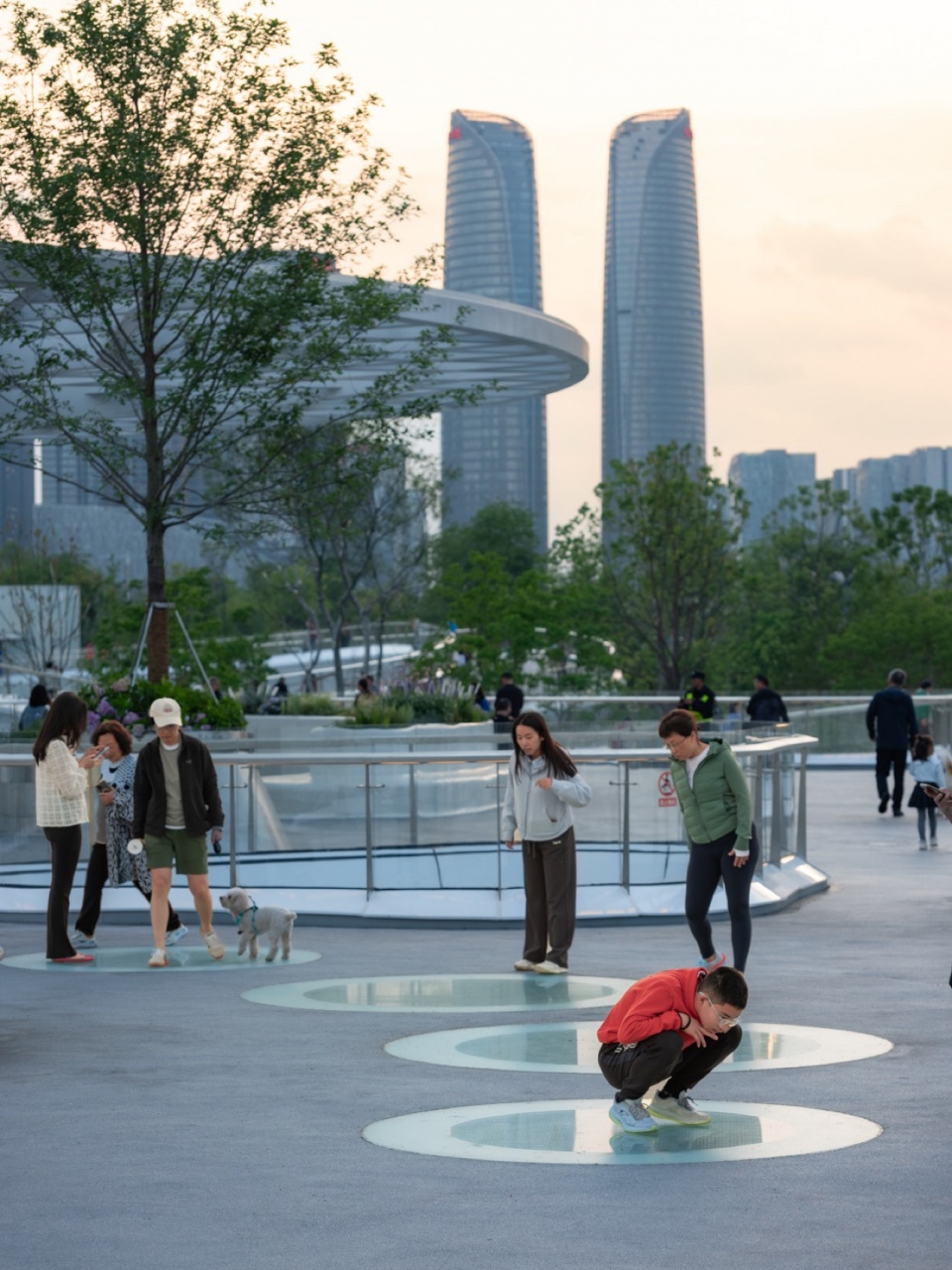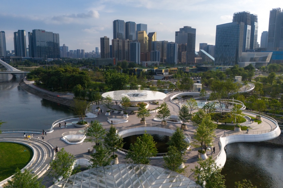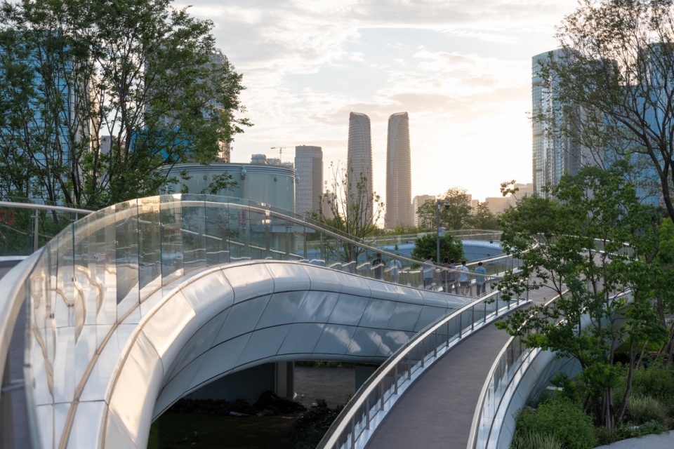 ▼远眺,桥面公园与交子公园连成一片,From a distance, the bridge park seamlessly connects with Jiaozhou Park, forming a unified landscape