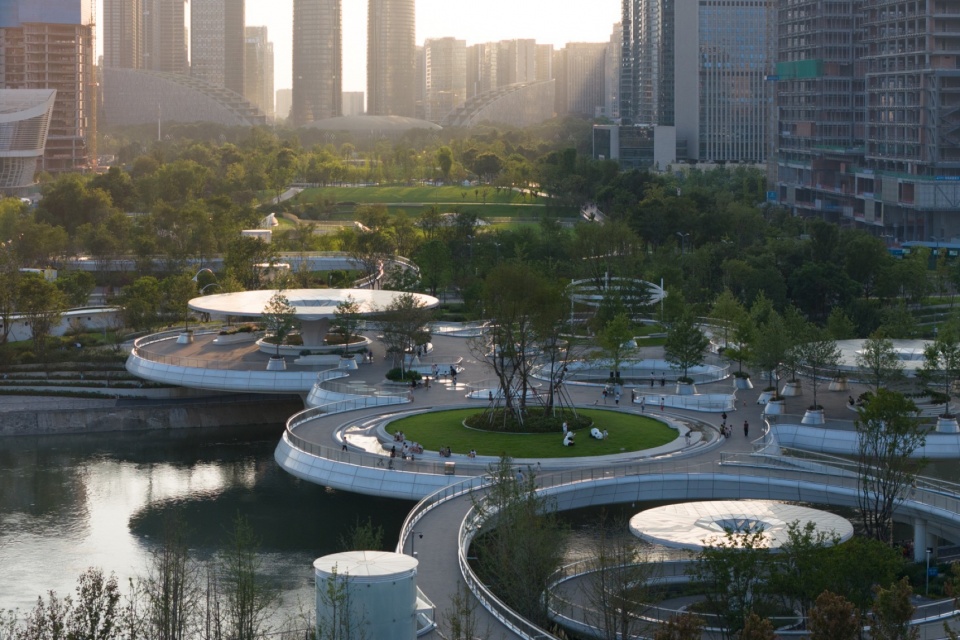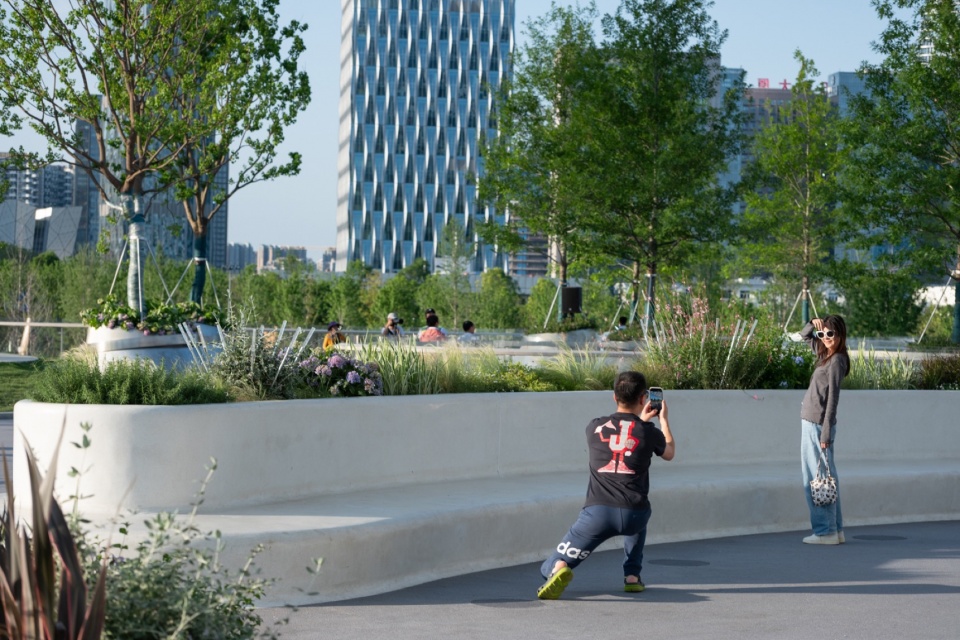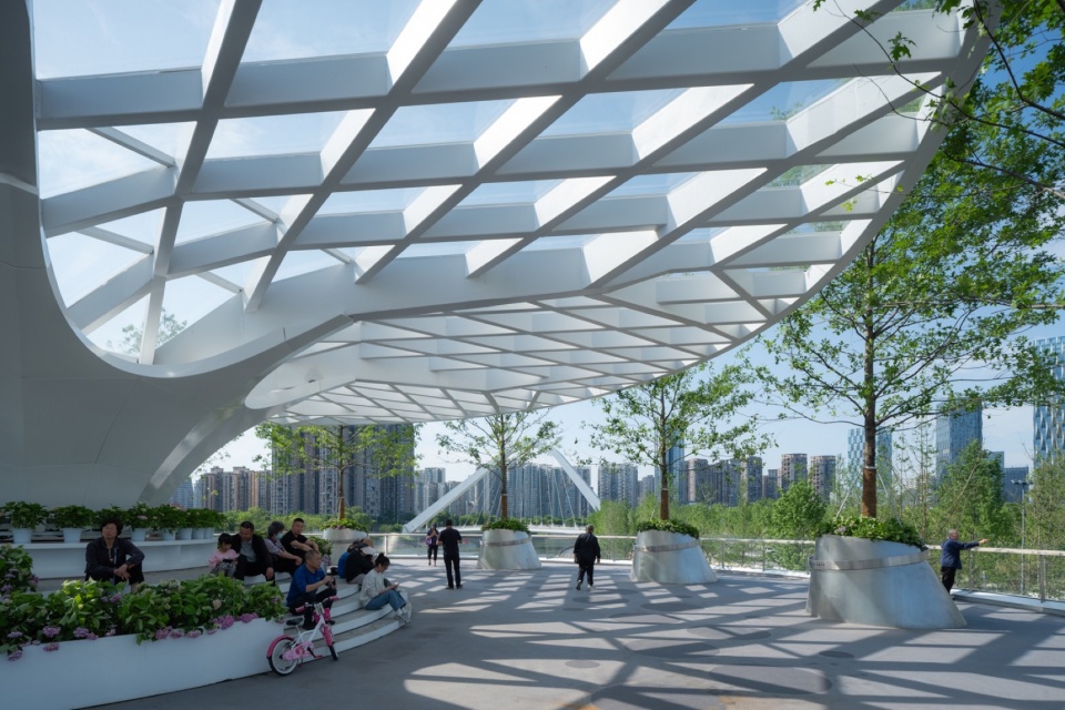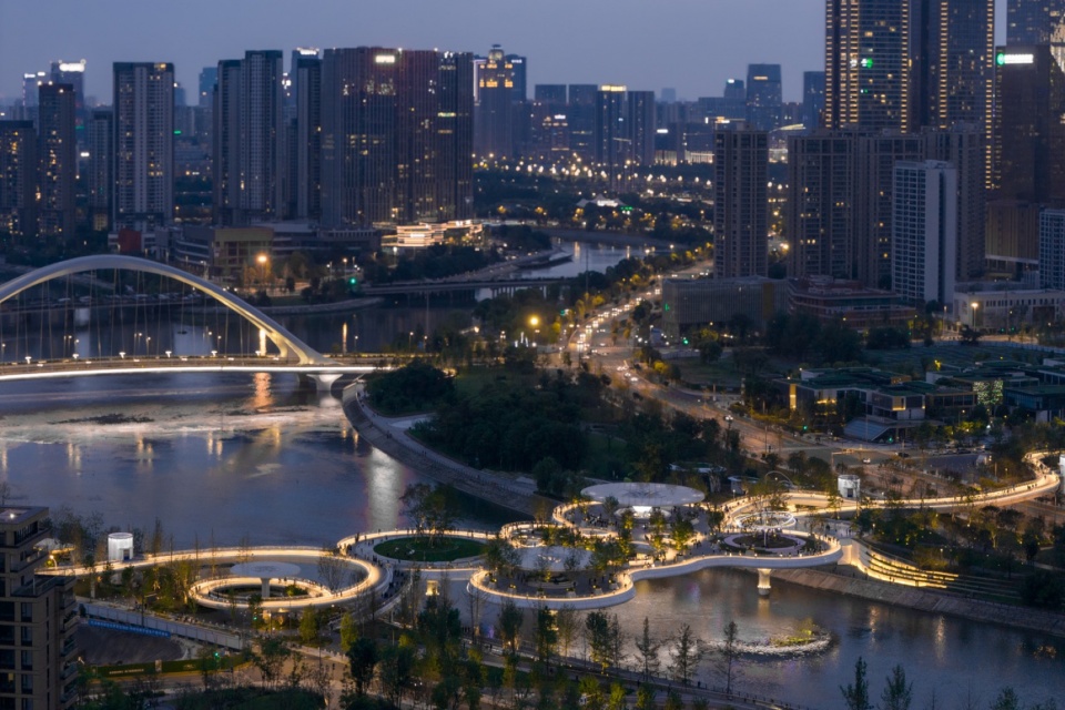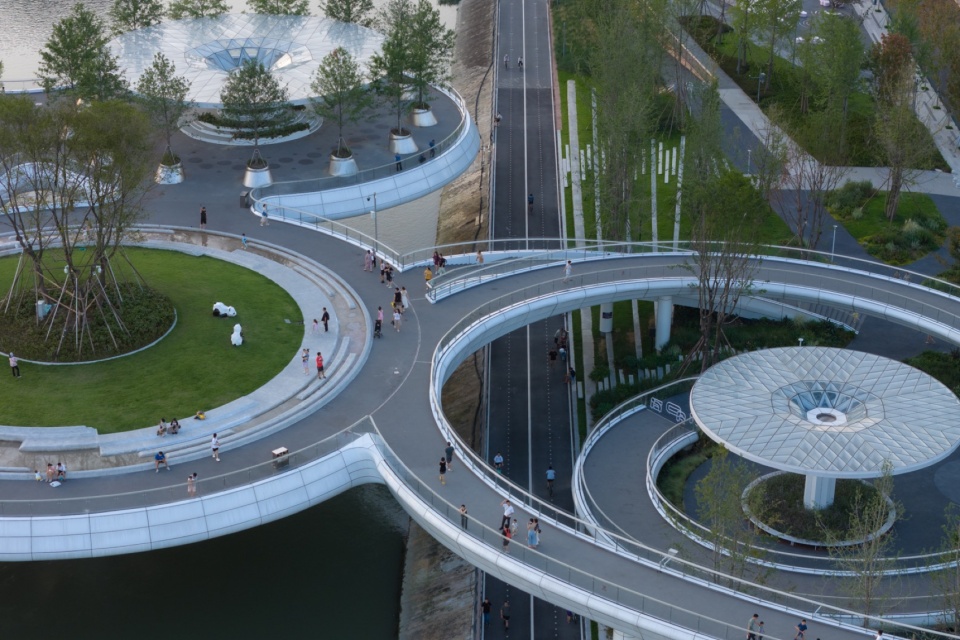 ▼远眺,桥面公园与交子公园连成一片,From a distance, the bridge park seamlessly connects with Jiaozhou Park, forming a unified landscape