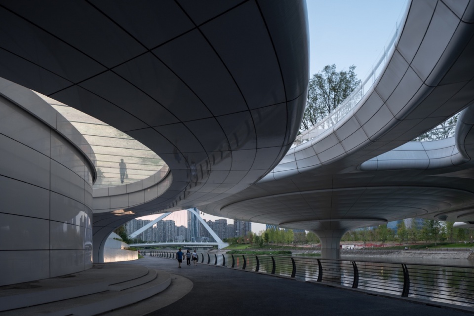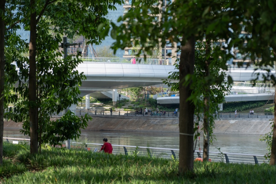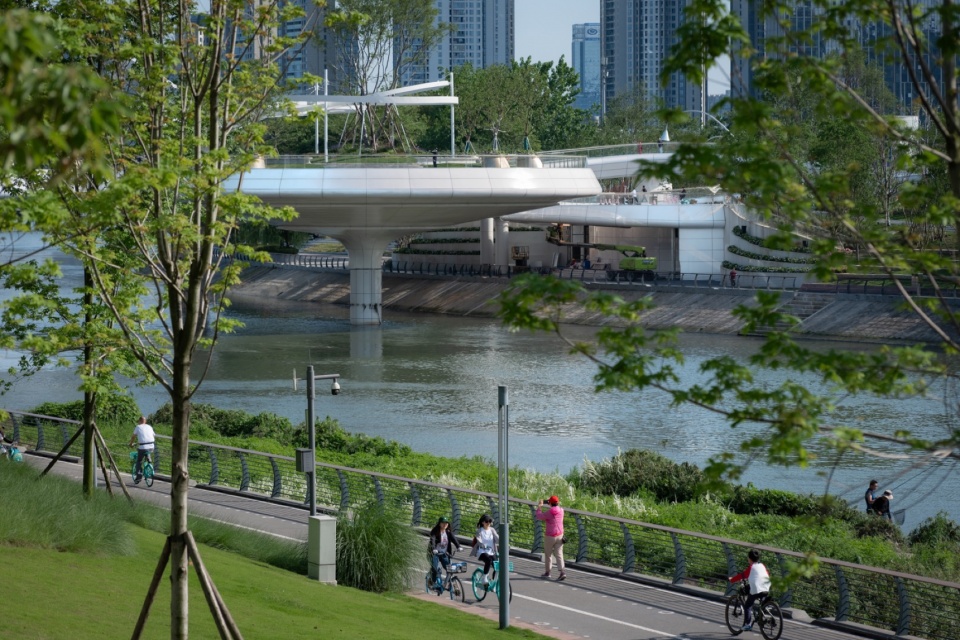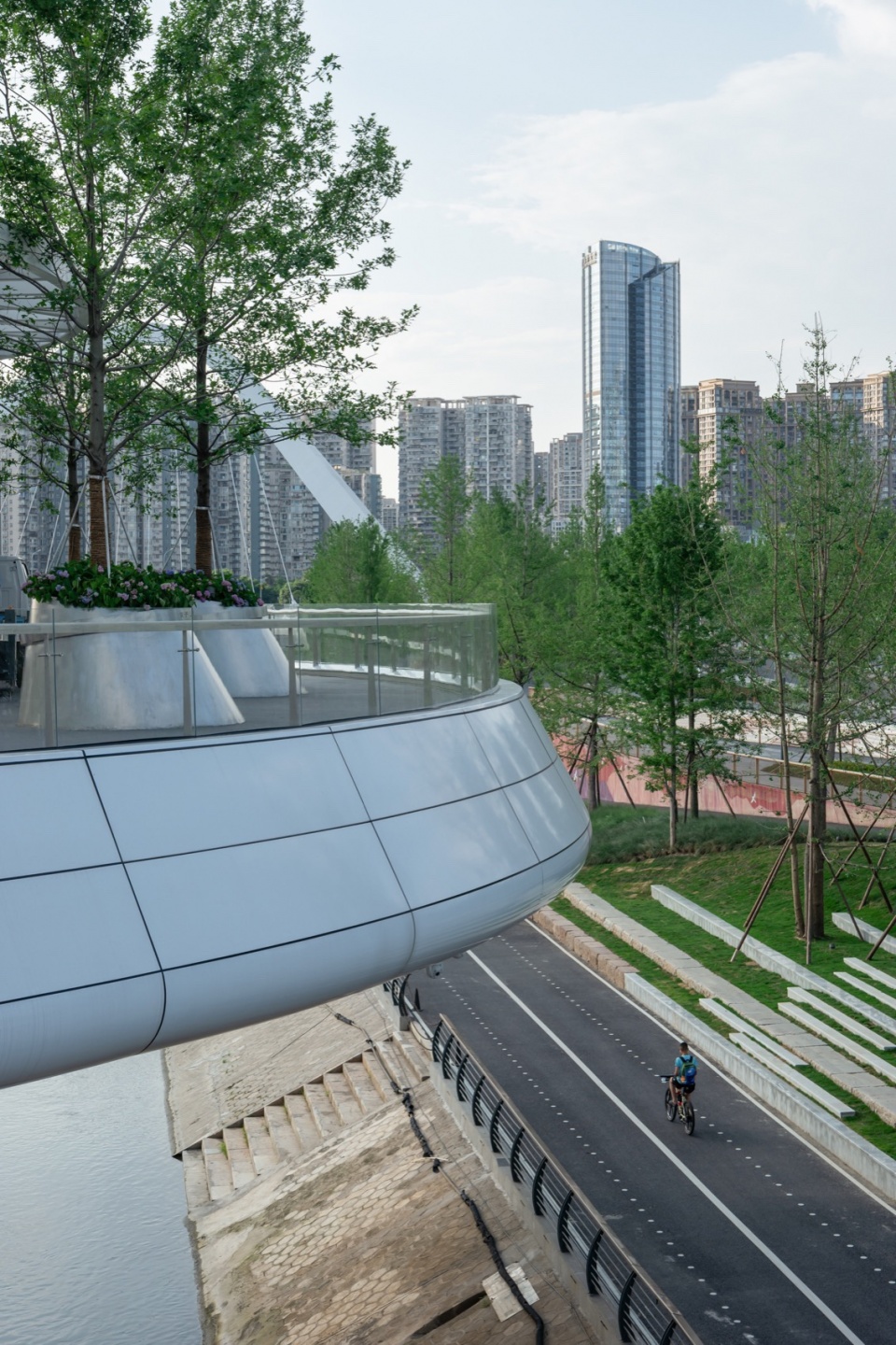 ▼从地面滨水绿道望向交子人行桥面公园,Perspective from the Riverside Greenway to the Jiaozi Pedestrian Bridge Park