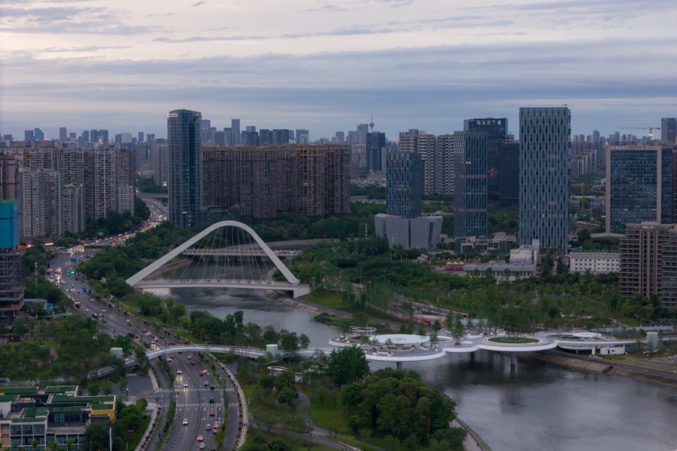 ▼从桥面公园望向交子绿轴,View of the Jiaozi Green Axis from the Bridge Park