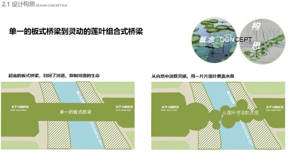 在这一前提下,桥梁设计团队提出了盖板式桥面公园的概念,保证了在桥面通行的基本功能下,还能最大程度链接东西公园的绿地系统,让人行走在桥面上,也是在公园的整体系统中。并提出单一的板式桥梁到灵动的莲叶组合式桥梁的思路,结构形式从自然中莲叶生长的茎杆中汲取灵感,创造出10大空间节点,增加桥面游逛内容的丰富度,实现绿色开放、全时共享的桥上花园。