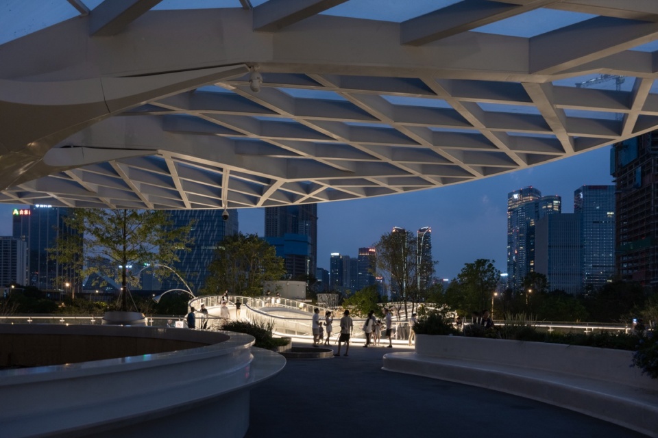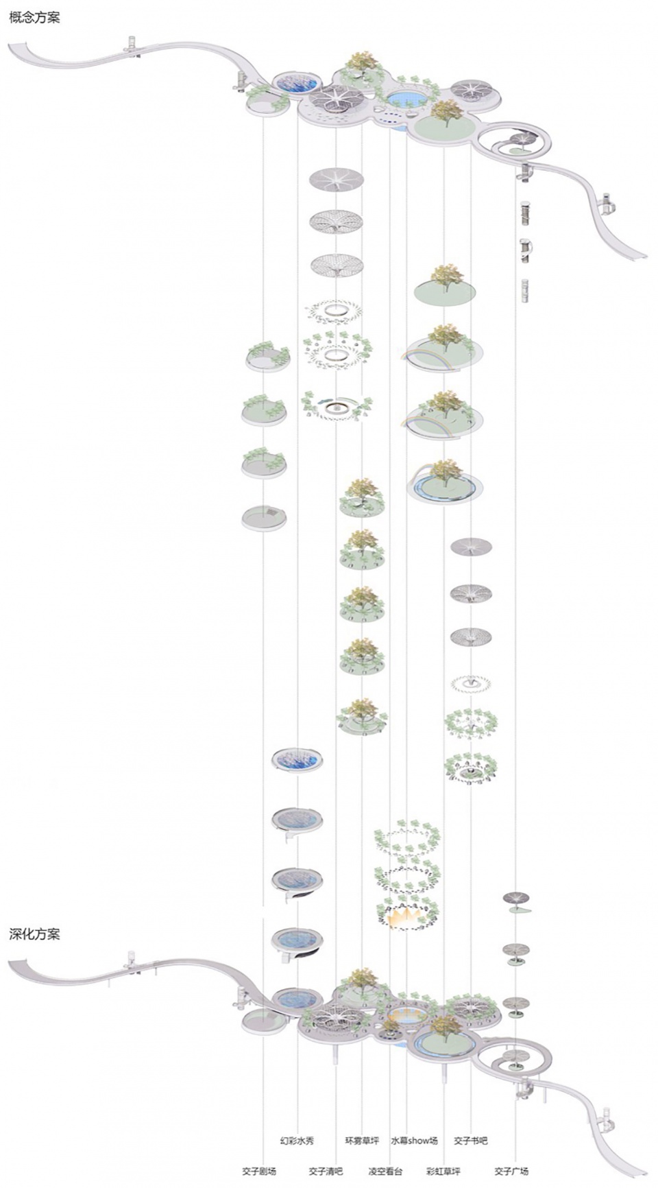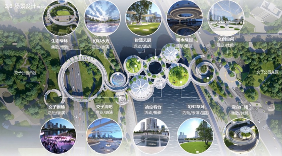 通过对这几个重要节点的场景想象,实现人行桥面公园公共、互动、休闲可玩的大致目标, 也通过精细化的设计和各专业紧密衔接,实现日夜景不同、智能管控等专项目标,为市民提供更多面更有趣的休闲体验目的地。