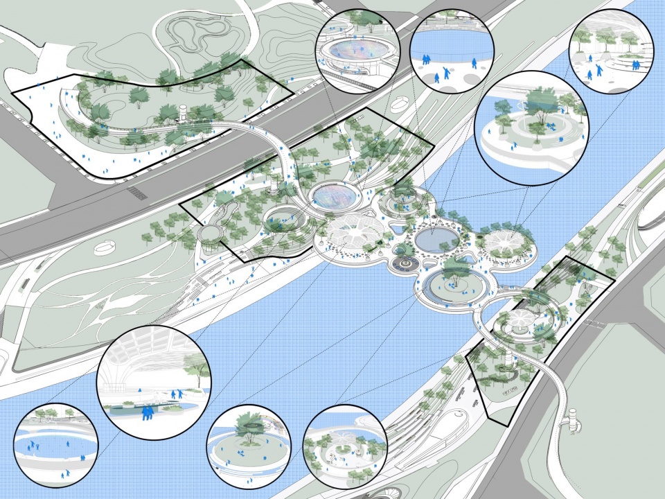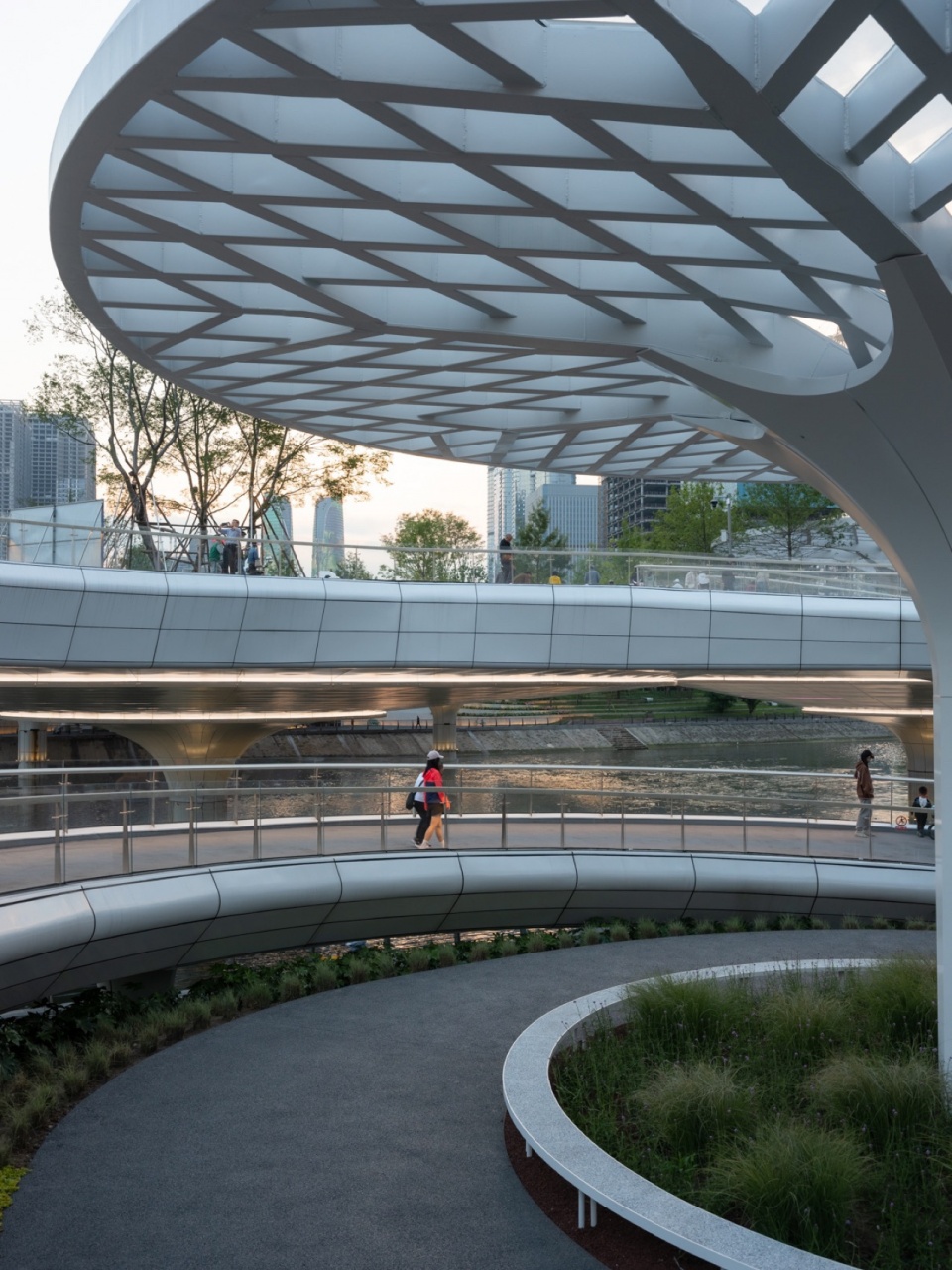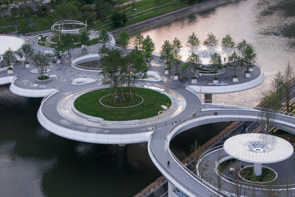 ▼多个“浮岛”链接的人行桥面公园,A pedestrian bridge park connecting multiple “floating islands”