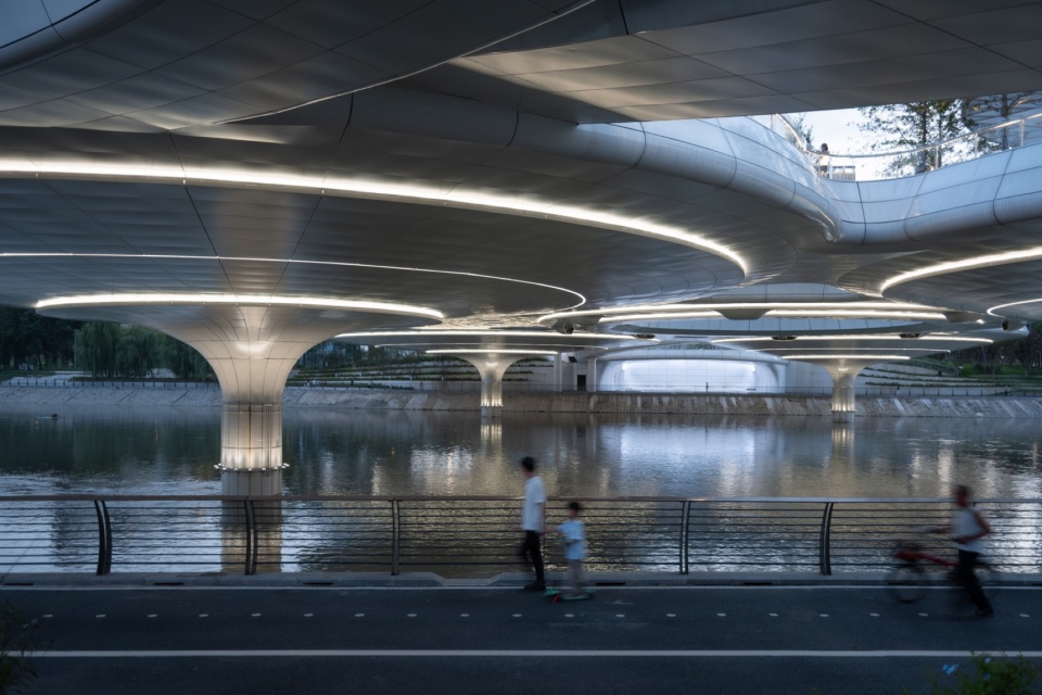 ▼桥下的空间形成很好的观水幕公共看台,The space beneath the bridge provides an excellent public viewing terrace for the water curtain display