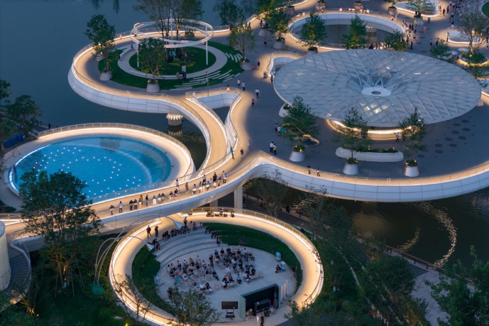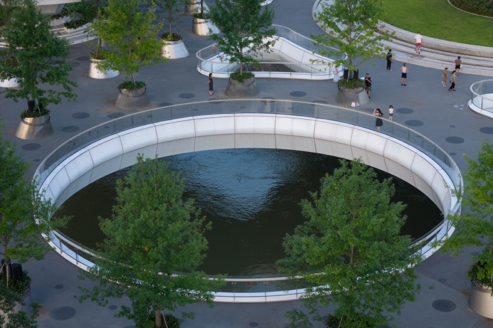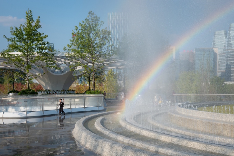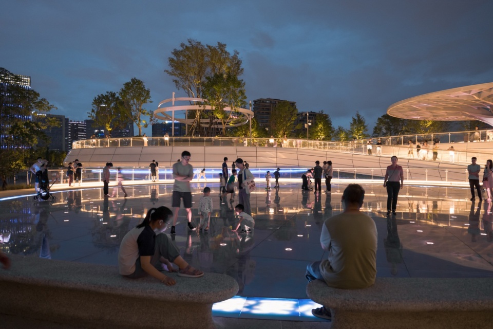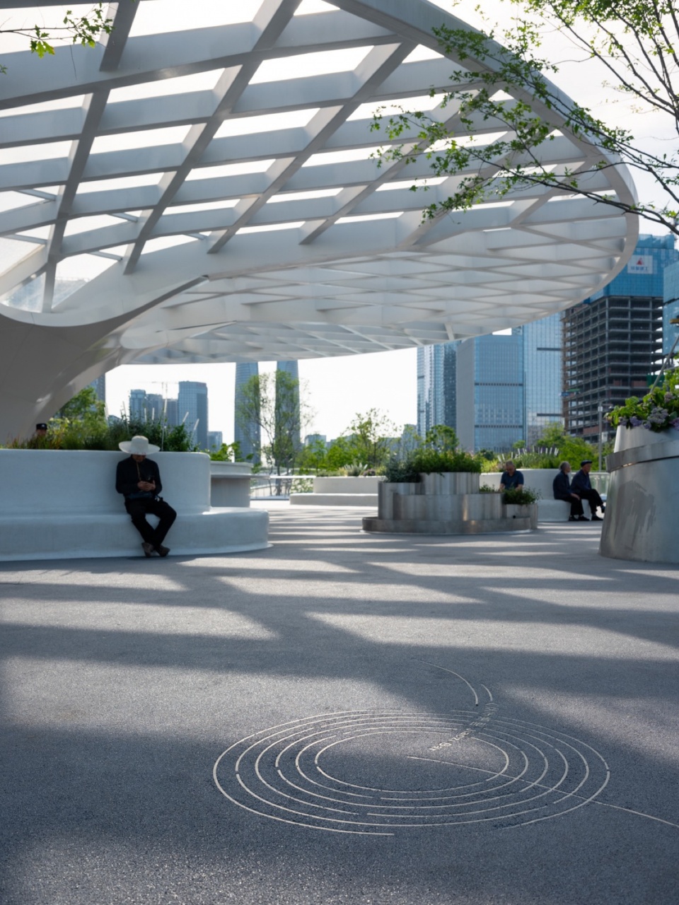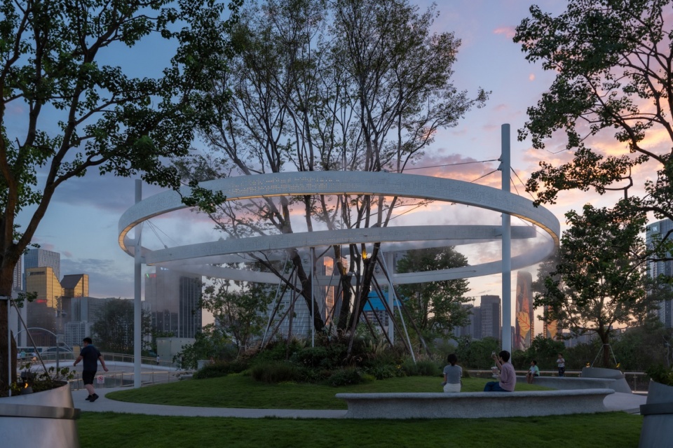 Inspired by the shape of ancient Jiaozi coins, the Mist Ring pays homage to the financial history of the surrounding Financial City district. Perforated panels and concealed lighting were incorporated to enhance the area’s ambient illumination. Additionally, a timed mist system provides a cooling effect for visitors during the summer months, offering a refreshing and comfortable space for relaxation.
