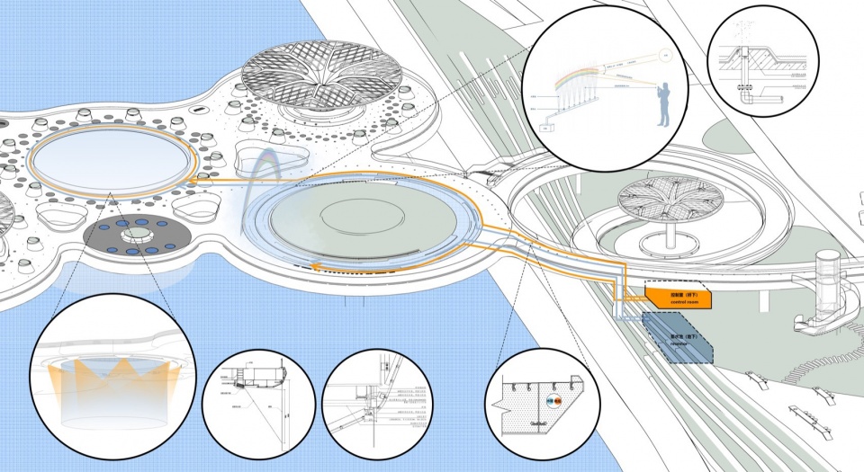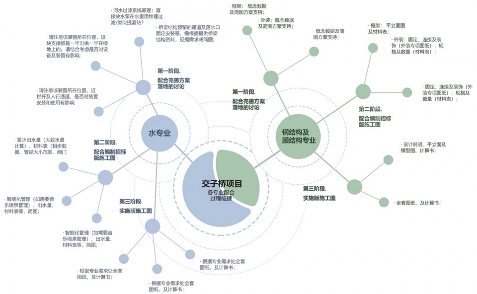 在与多专业的多家供应商、顾问团队讨论后,最终确定多节点的组合关系。明确了设计深化工作的组成顺序。例如,需要兼顾多景观节点的供水,在给水方案上,如何到达桥面就有多条路径,但需要协同各专业一起讨论,得出初步实施方案,再经由业主方、物业管理等给出具体操作意见,再到落地的方案和技术图纸。给水达到桥面,需要再协同桥梁设计,尽量实现管线的隐藏,桥面因为面层厚度无法通过,需要从墩柱侧面寻找路径穿过,且避免能量损耗保证加压水景的功效,管道路径保证在120米以内,再从桥板面有限开孔区域升至桥面景观节点处… …诸如此类问题,需要集中的在深化设计的全过程与各专业紧密协同,保证最终呈现的终极效果。