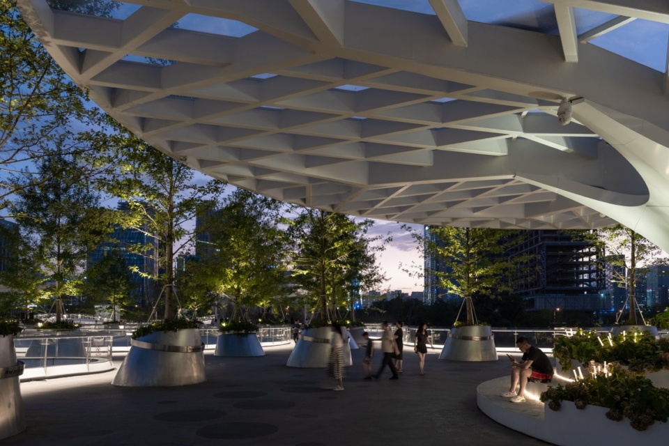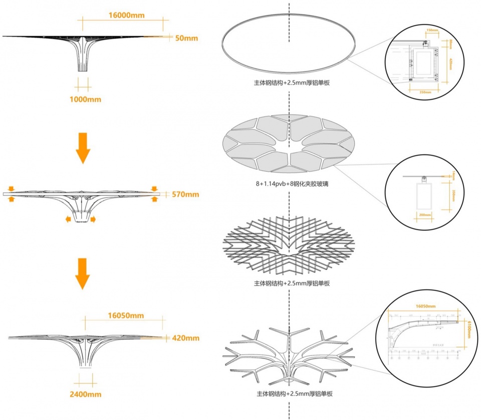 但因为本身处于河道中,抗震、风力、结构荷载等诸多因素影响着大跨度的挑檐的结构实验。其中最大跨度的一号廊架,挑檐宽度达16米,并且要实现极致轻薄的边缘檐口效果,我们在结构形式上尝试过无数次,最终形成雪花状结构龙骨,叠加钢化玻璃的形式。将顶部中心向内凹,形成雨水回收的低点,利用桥墩柱向下排水,保证廊架下方足够的风雨遮蔽空间。用网状龙骨拉紧廊架,边缘处做到最小的420mm梁高,并直接用结构外露的形式,保证最小高度,再由幕墙专业于主龙骨中部区域进行外饰面衔接,以优美曲线衔接至完成面。