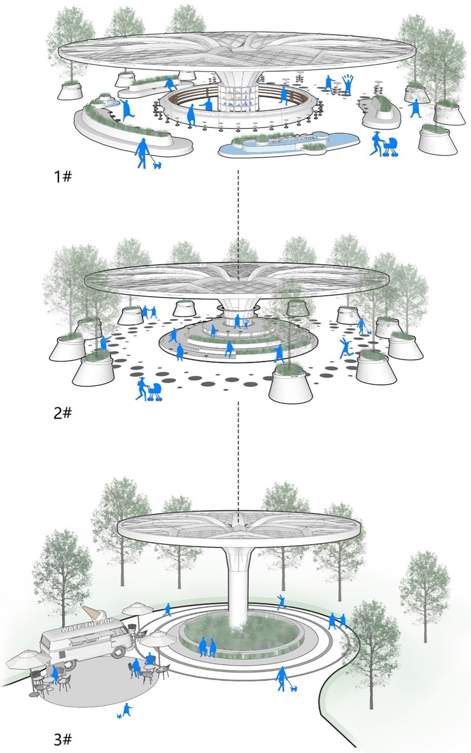 三处廊架分别被赋予桥面清吧、交子书吧、交子广场的使用功能,为将来运营提供可能性,最大化提升市民休闲体验感,也使得场景活化,加强与人的交互联系,提供更多有功能性的景观场景空间。