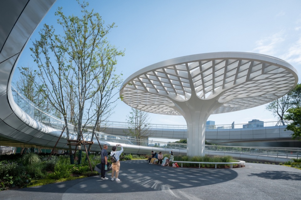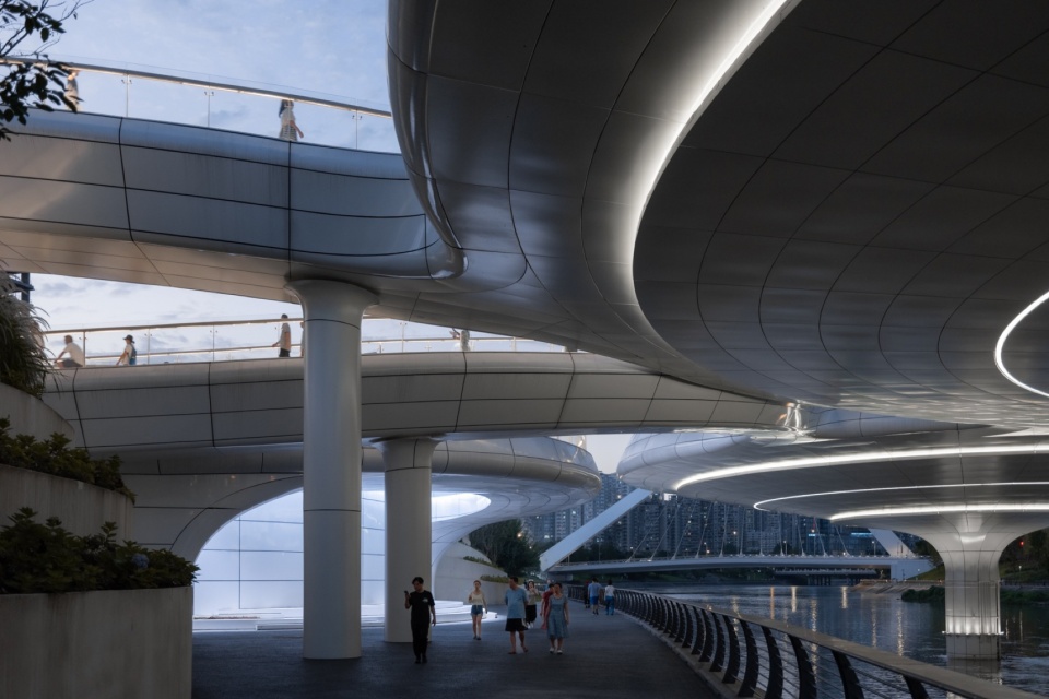 ▼起坡的廊桥围绕着三号廊架螺旋升起,The sloped pedestrian bridge spirals upward around Colonnade No. 3, forming a dynamic architectural feature