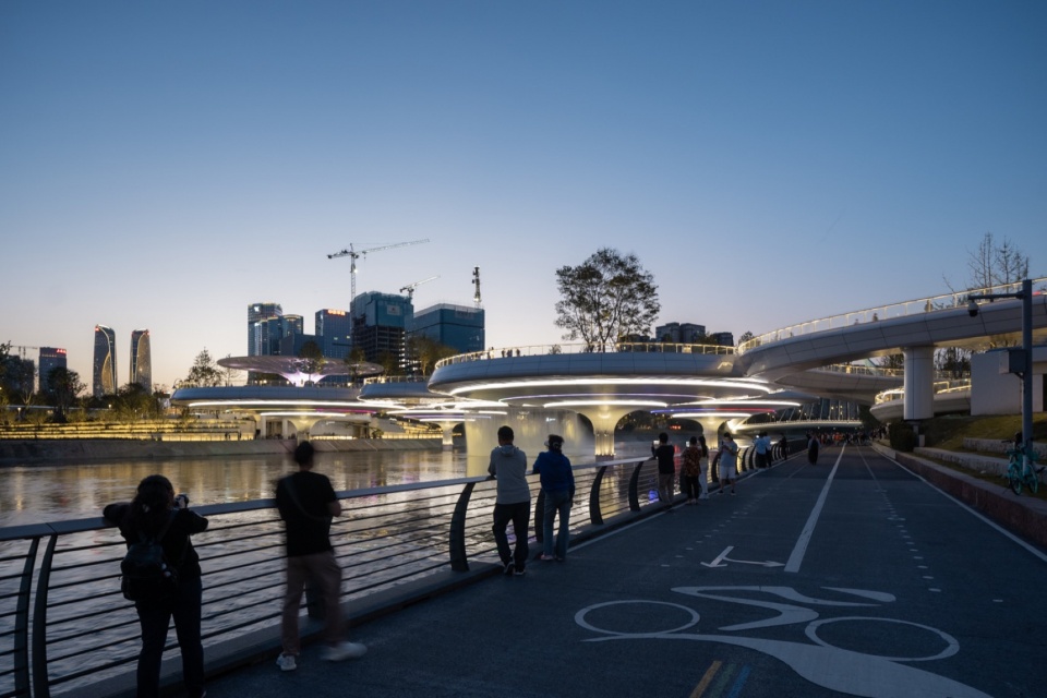 ▼夏日暮色十分,人们漫步交子人行桥面公园,Summer Twilight: Visitors Strolling Through the Jiaozi Pedestrian Bridge Park