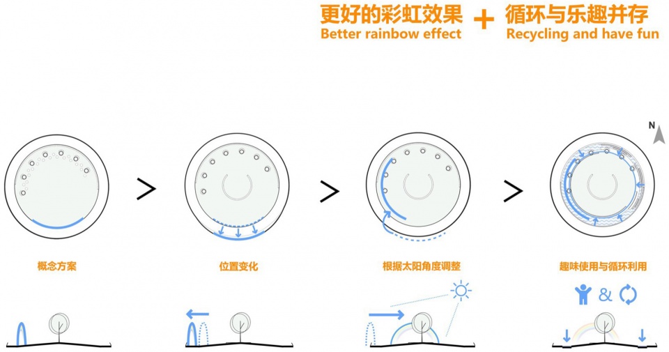 在布置好夜间的景观点位的同时,白天也呼应主题,设置一处人造彩虹。根据太阳高度角的位置,在桥面合拢后实时进行现场检测,调整规划了最适合桥面成型的角度方位和观看时间,同样利用加压水柱(但控制喷射出口控制,对人体无危害)向上形成喷射柱,形成水雾墙后,在20米左右范围形成最佳观赏点。
