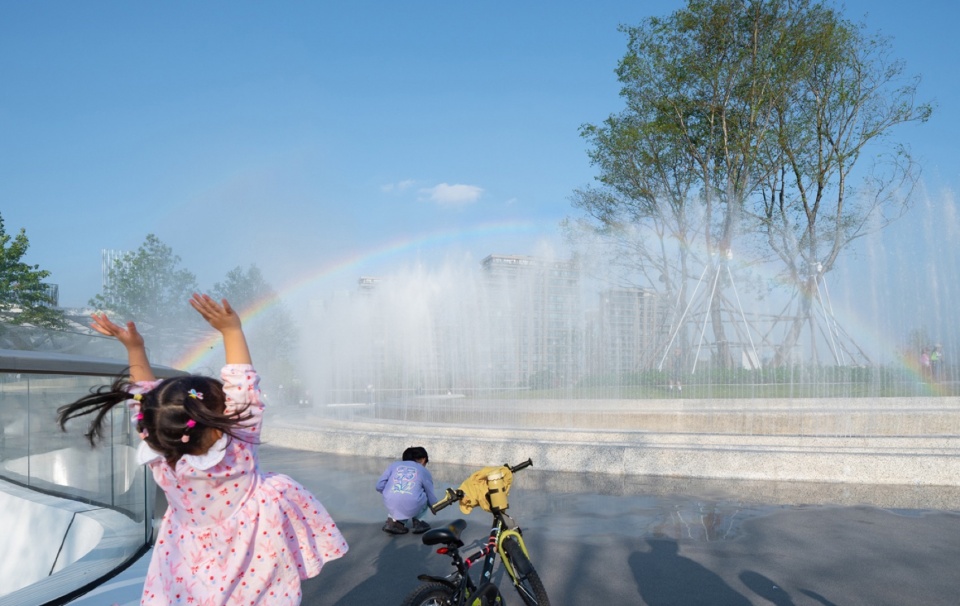 ▼承接彩虹水柱落下的水池,也成为孩童嬉戏的场所,The pool collecting water from the rainbow jets doubles as an interactive play area for children