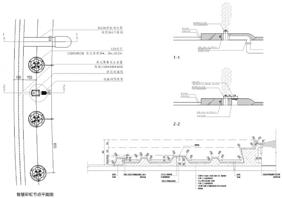 After discussions with multiple suppliers and consultant teams across various disciplines, the combination relationships of the various nodes were ultimately determined. This led to the establishment of the sequence for design detailing. For instance, considering the water supply needs of various landscape nodes, multiple potential pathways for delivering water to the bridge deck were explored. These pathways required interdisciplinary coordination to develop an initial implementation plan, which was further refined based on input from stakeholders such as the project owner and property management. The finalized implementation plan and technical drawings were derived through this iterative process.Delivering water to the bridge deck necessitated additional coordination with bridge designers to hide pipelines wherever possible. Since the surface layer thickness of the bridge could not accommodate pipes, alternative routes were identified along the sides of the piers to avoid energy loss and ensure the efficiency of pressurized water features. Pipeline pathways were designed to remain within a 120-meter limit, ascending through limited perforations on the bridge deck to reach designated landscape nodes. Challenges of this nature required continuous interdisciplinary collaboration throughout the detailed design process to achieve the optimal final presentation.