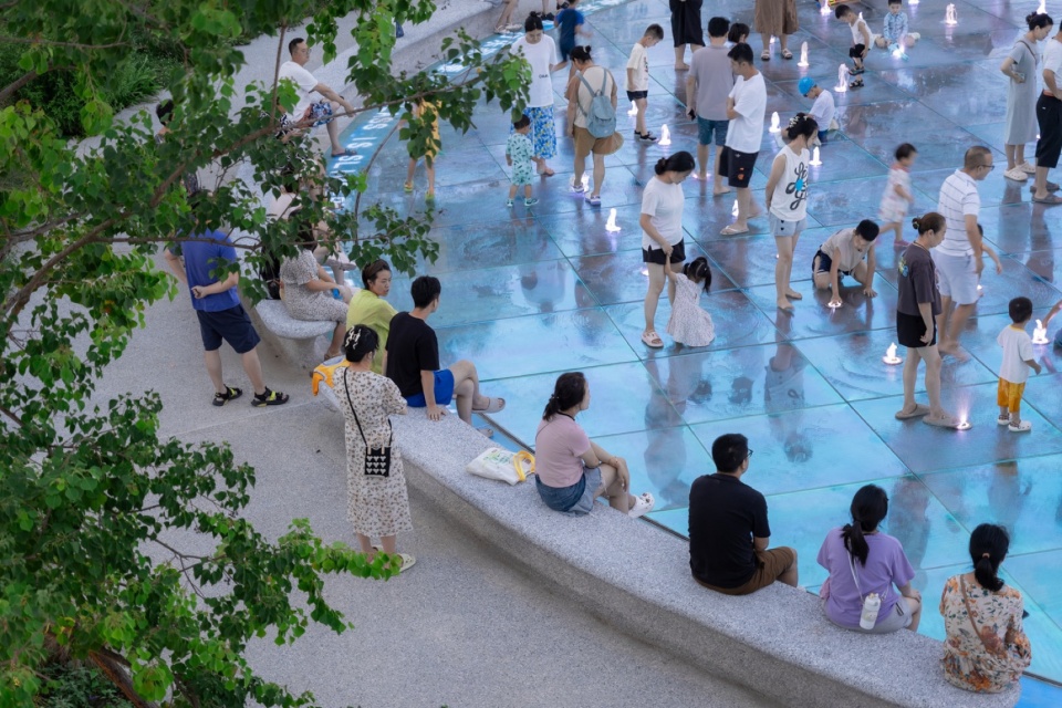▼人们在水景嬉戏时,也感受炫彩玻璃变色的效果,Visitors playing in the water can experience the dynamic color-shifting effects of the glass