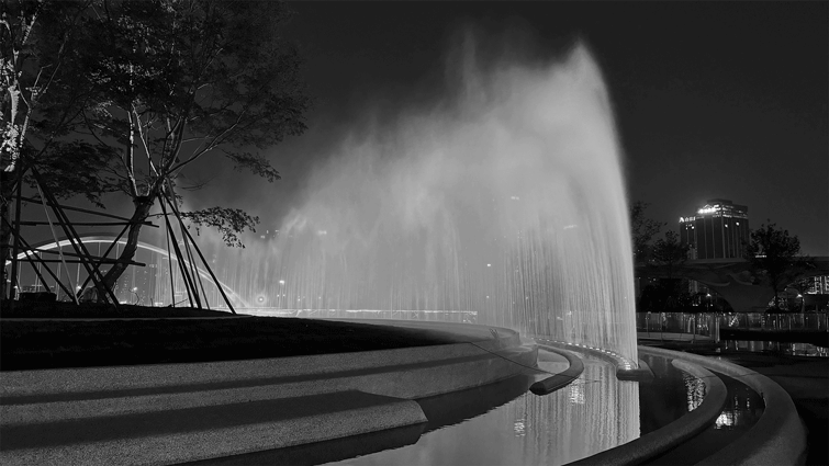 The bridge deck park is a key landmark for future Jinjiang River night tours. To enhance this experience, an interactive mist screen was installed in the open central area of the bridge deck. Utilizing the elevation difference between the bridge and the water surface, pressurized water jets create vertical mist columns. Integrated light and sound effects, combined with six hidden projection devices set beneath the circular ceiling structure, project visuals onto the mist screen at precise angles.