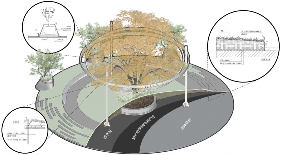 在桥面上的乔木存在阵列和点植两种形式。点植在草坪上的大乔除了对土壤、根系定点检测以外,还需要设置固化的隐藏种植池来固定根部且表面形态自然融合。阵列的乔木使用独立种植池来完成桥面种植,在定制的不锈钢种植器内部同样布置防水涂层并固定于钢桥面,以轻质透水材料置于底部,且布置导水管解决浇灌及雨水渗透,形成单独种植池以布置二乔。