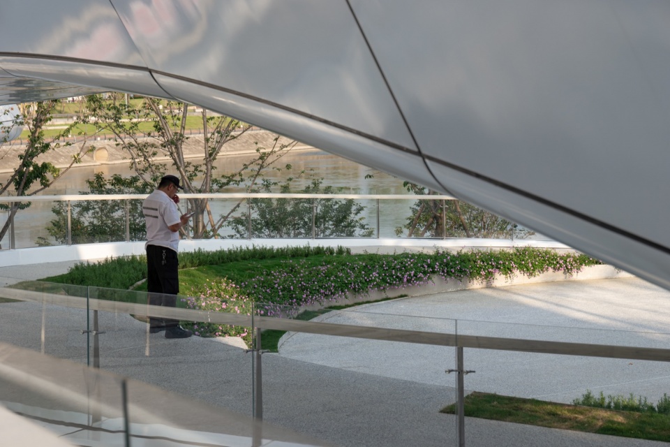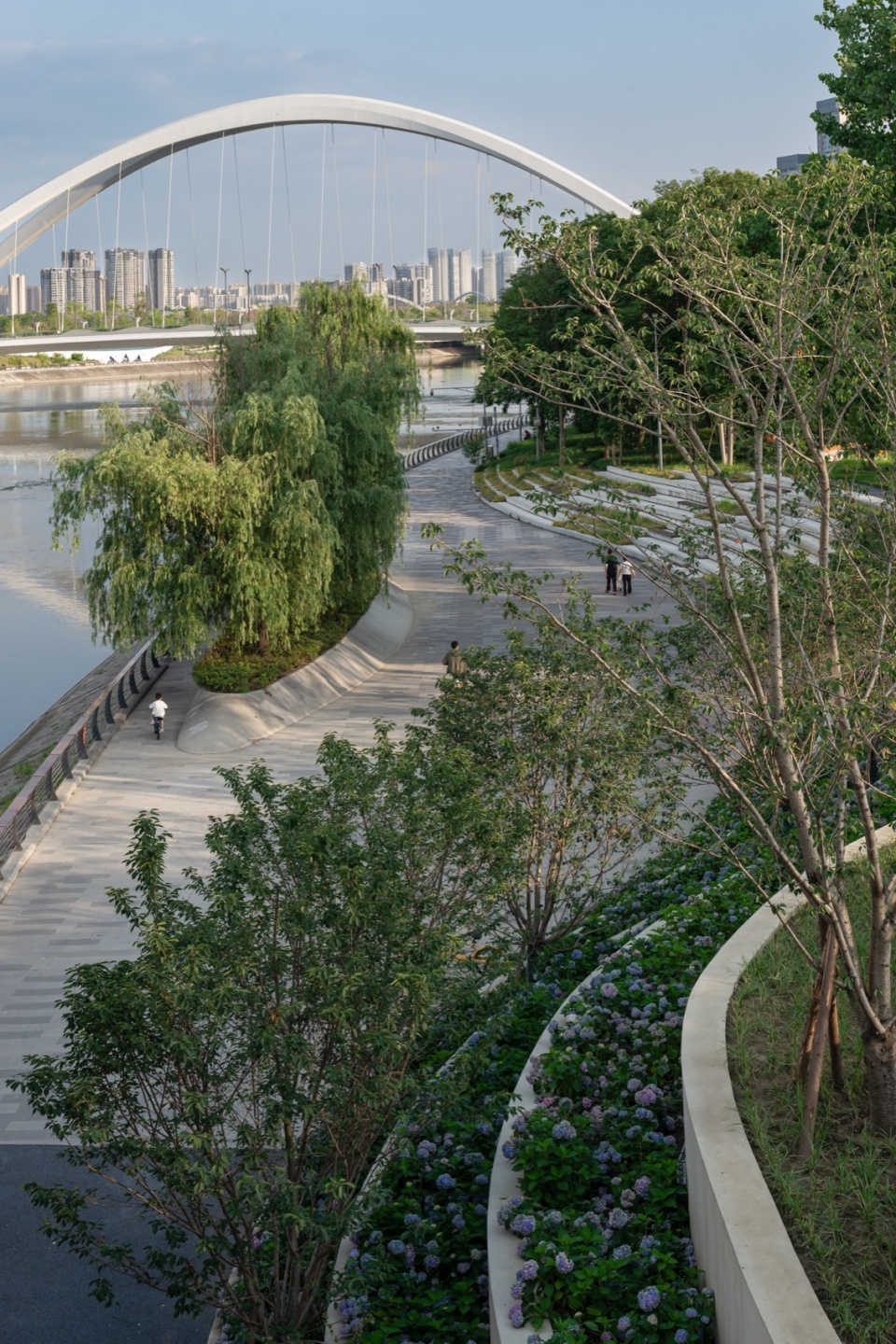 The terraced greenery connects seamlessly with the natural texture of the riverside greenbelt
