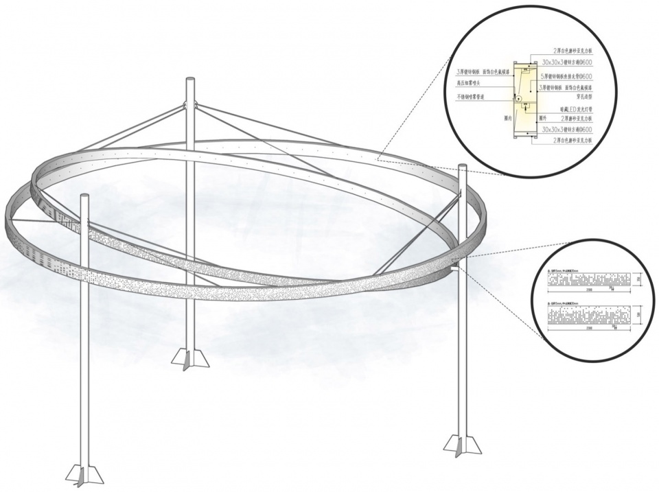 雾环借鉴了交子钱币的环形,回应所在地金融城的历史背景。利用穿孔板及下部的光源设置,解决该区域部分照明氛围的同时,也提供定时控制的雾森装置,在夏季,以提供给休憩的人群以清凉的感受。