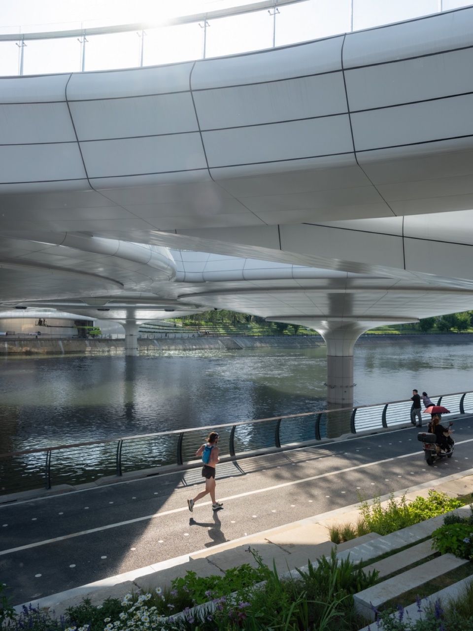 ▼滨江绿道上看到的人行桥下部,View of the Underside of the Pedestrian Bridge from the Riverside Greenway