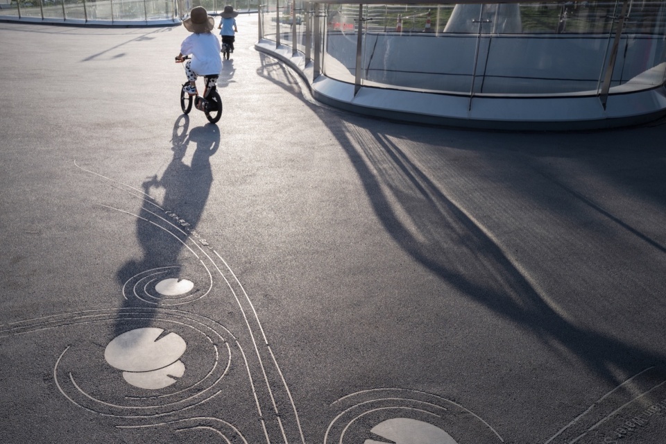 ▼桥面的导视结合主题 轻盈弥漫在桥面铺装上,The bridge’s wayfinding system is thoughtfully integrated into the theme, lightly blending with the bridge’s paving design
