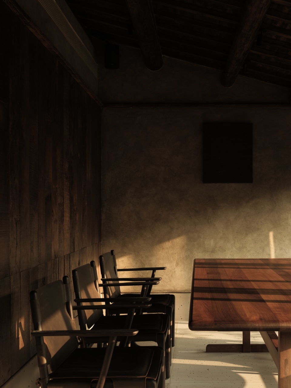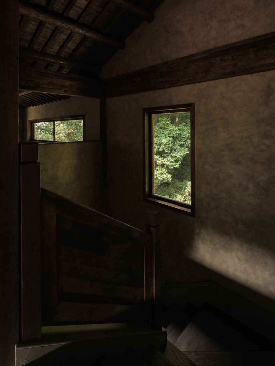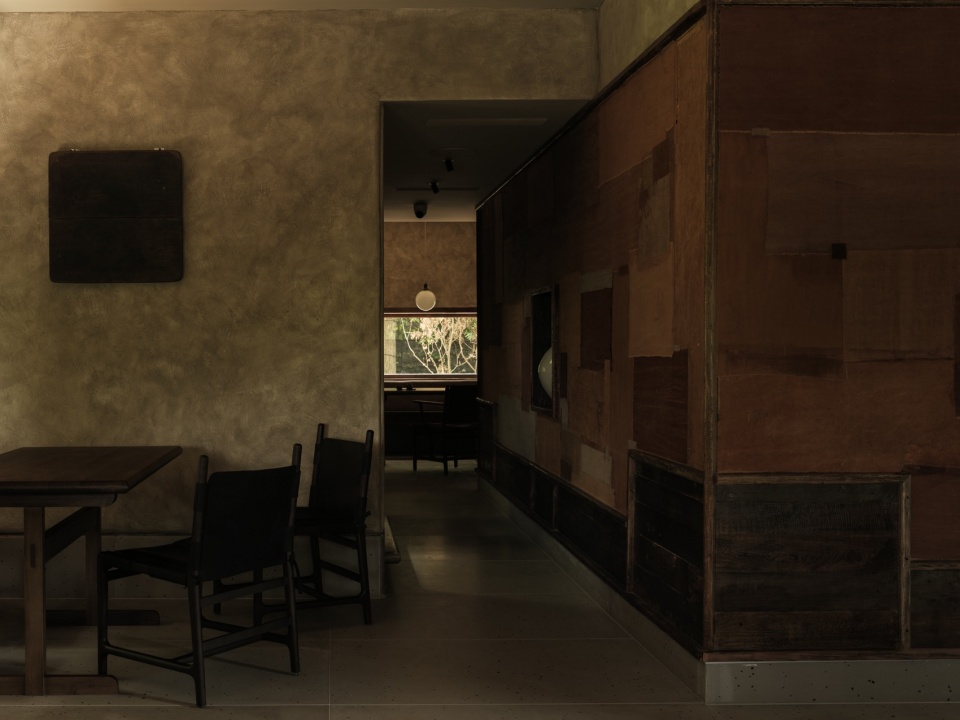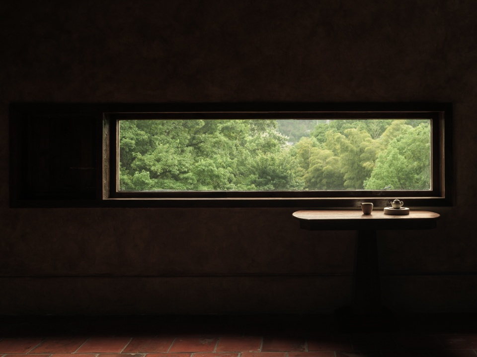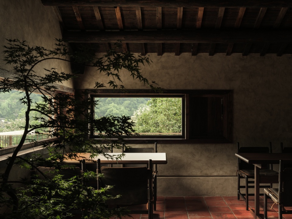 从入口处的小桥流水开始,空间便以“起承转合”的节奏展开。青苔石阶蜿蜒而上,如《溪山行旅图》中的山径,每一步都暗藏玄机:低处的涧溪声若隐若现,中庭回廊光影斑驳,高处的露台豁然开朗。设计师利用地势高差,将三个楼层串联成“登高悟禅”的序列——一楼吧台的长木桌与古树相映,二楼茶室借窗框景,将远山裁剪成画;三楼露台则彻底敞开,山风裹挟茶香扑面而来。开窗设计尤具匠心:或窄如竖幅,聚焦一株孤松;或横贯墙面,收纳整片竹林;或斜切天光,让阳光在室内游走如笔锋。移步异景间,空间不再是容器,而成为引导观者发现自然之美的禅意路径。
