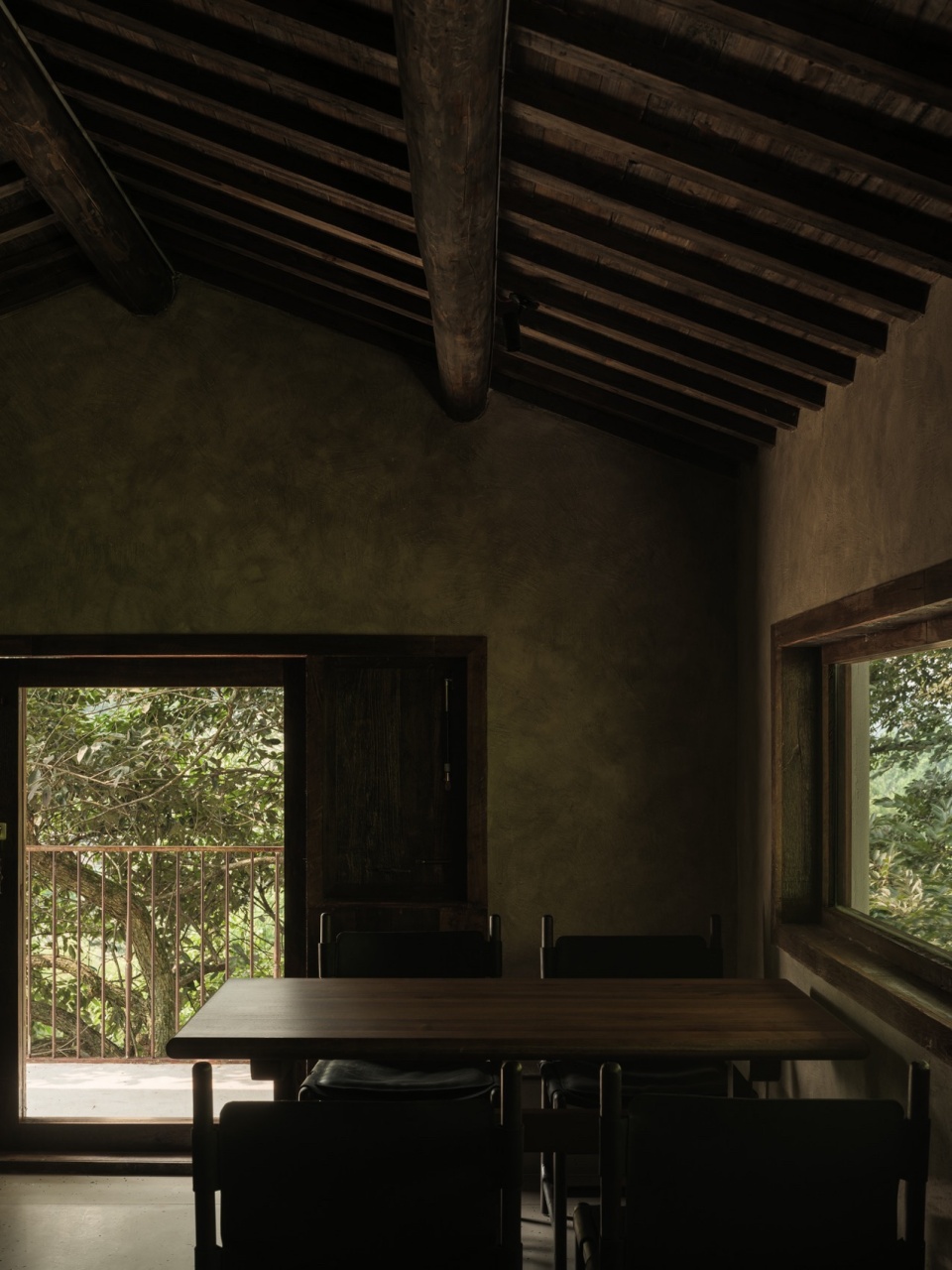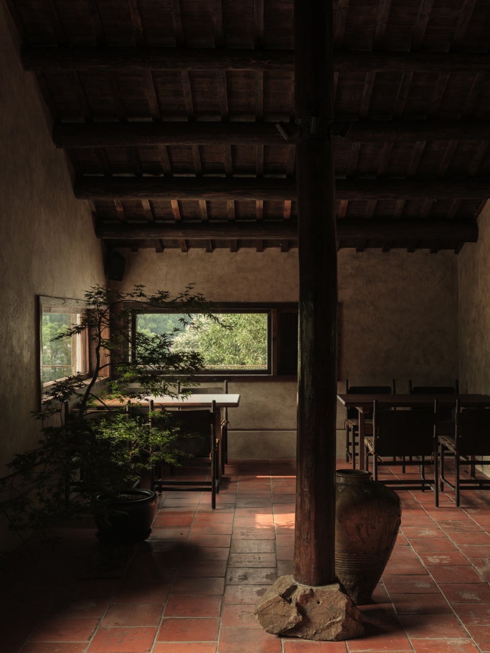 From the entrance, where a small bridge spans a flowing stream, the space unfolds in a rhythm of “beginning, continuation, transition, and conclusion.” Moss-covered stone steps wind upward, reminiscent of the mountain paths in Travelers Among Mountains and Streams, with each step revealing a hidden detail: the faint murmur of a stream below, the dappled light in the central courtyard corridor, and the expansive view from the upper terrace. The designer leverages the terrain’s elevation to connect the three floors into a sequence of “ascending to enlightenment.” The long wooden table on the first floor mirrors an ancient tree, the tea room on the second floor frames distant mountains like a painting, and the third-floor terrace opens completely, allowing mountain breezes carrying the scent of tea to greet visitors. The window designs are particularly ingenious: some narrow as vertical scrolls, focusing on a solitary pine; others spanning horizontally to capture an entire bamboo grove; and some angled to let sunlight dance across the interior like brushstrokes. As one moves through the space, it transforms from a mere container into a Zen path guiding visitors to discover the beauty of nature.