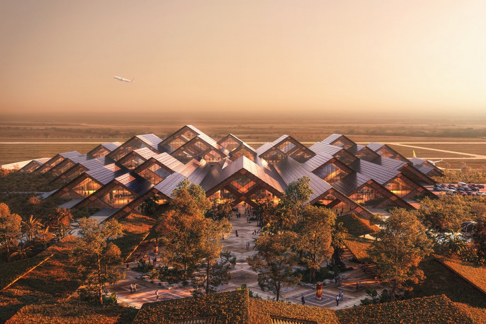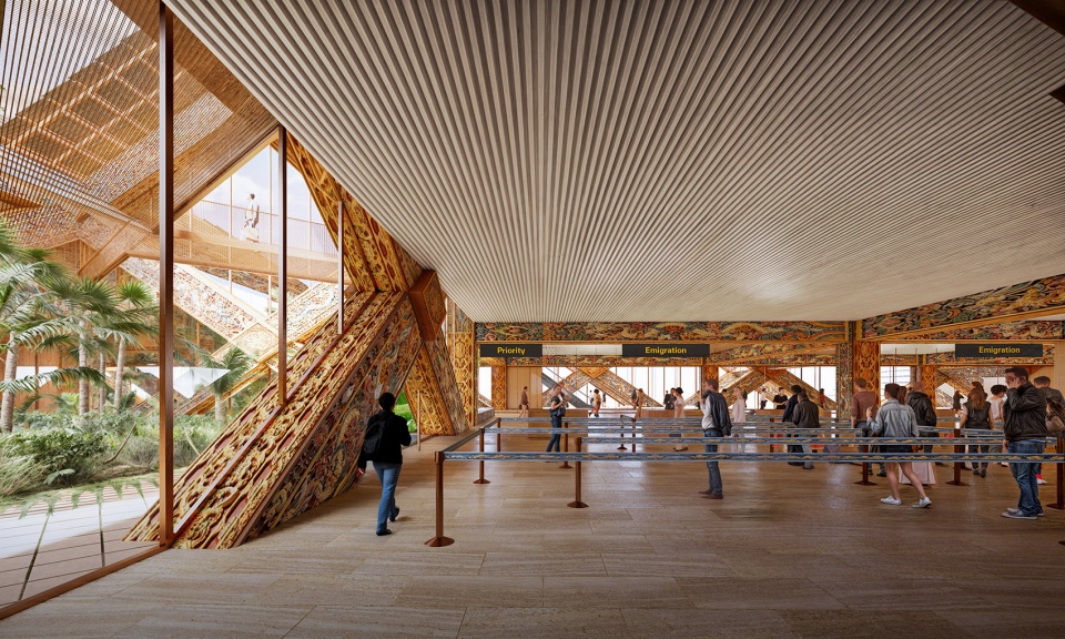 作为不丹的第二座国际机场,Gelephu国际机场位于不丹-印度边境附近,毗邻派塔河,被不丹郁郁葱葱的亚热带森林、群山和河流环绕。机场总占地68,000平方米,由BIG、Arup和Cistri共同规划设计,作为格列普正念城市(Gelephu Mindfulness City, GMC)总体规划的重要组成部分,并与航空工程公司NACO合作建造。机场预计可每日运营123架次航班,到2040年年客流量预计达到130万人次,到2065年增长至550万人次。2025年威尼斯建筑双年展将展出一件机场外立面仿木结构的钻石形装置,由一位不丹艺术家和机器共同雕刻,以实时呈现传统与创新的交融,既展现不丹木雕的历史传承,也探索技术在保护和推进工艺中的作用。