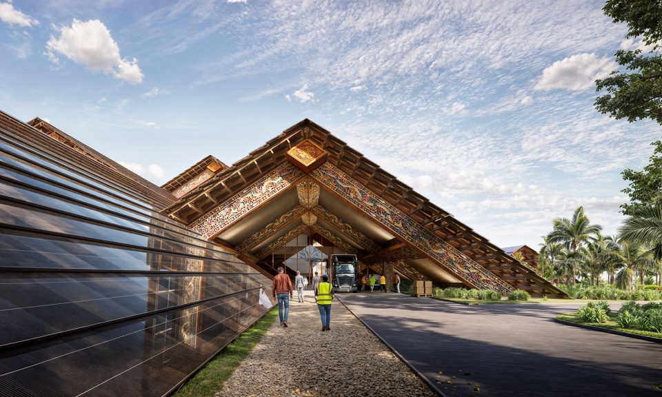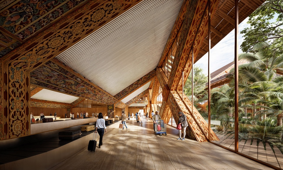 Gelephu国际机场融合了不丹传统工艺与现代创新,采用胶合木建造的模块化网格结构,并装饰有彩绘雕刻。这一设计将在2025年威尼斯建筑双年展“Ancient Future”单元展出,展期从5月持续至9月。
