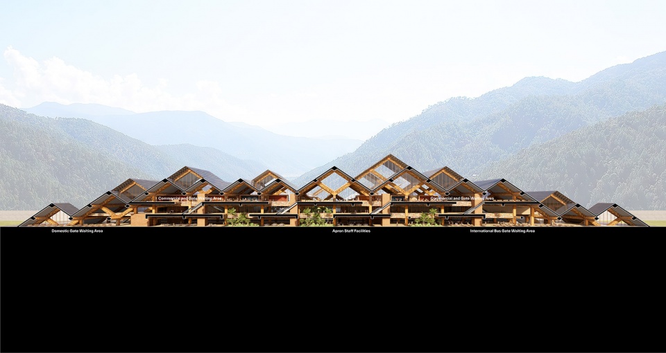 机场建筑采用模块化大规模木结构,提供灵活扩展性,远观如一座风格化的山脉。近看则可发现所有木构件都经过传统雕刻与上色,并装饰有象征不丹过去、现在与未来的三种龙纹。这一设计既传统又前卫,既面向未来,又根植历史文化。
