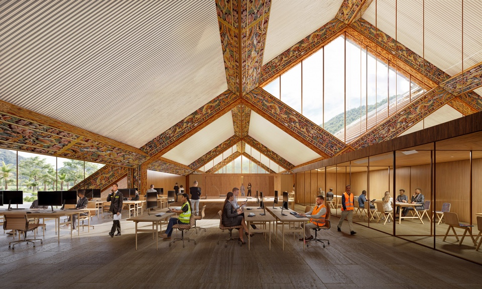 The airport architecture is composed of modular mass timber frames providing flexibility and expandability, resembling a stylized mountainrange at a distance. Upon closer inspection, all the mass timber members are carved and colored according to traditional craft, adorned with three types of dragons representing the past, present, and future of Bhutan. The result is traditional yet avant- garde, forward-reaching and rooted.