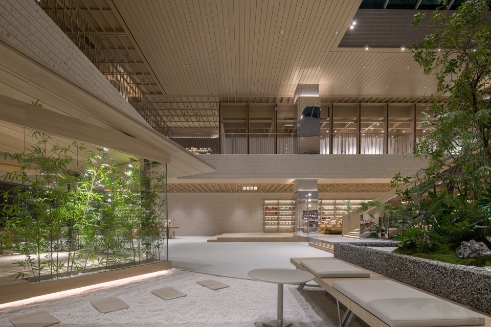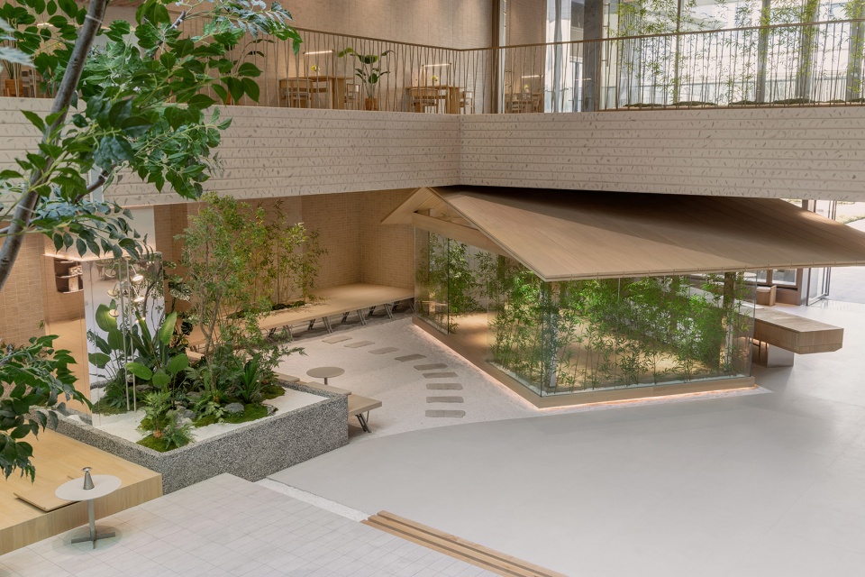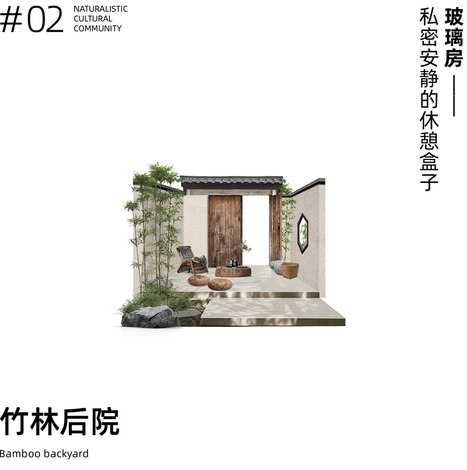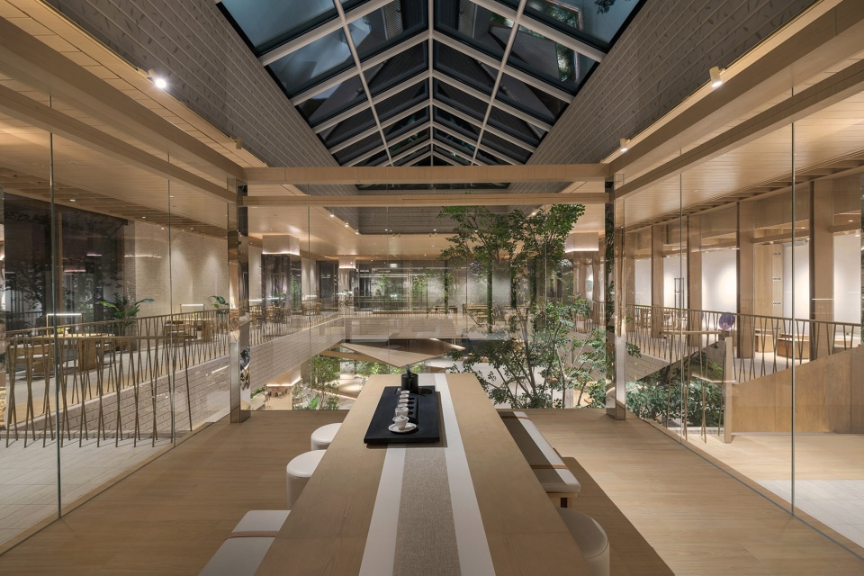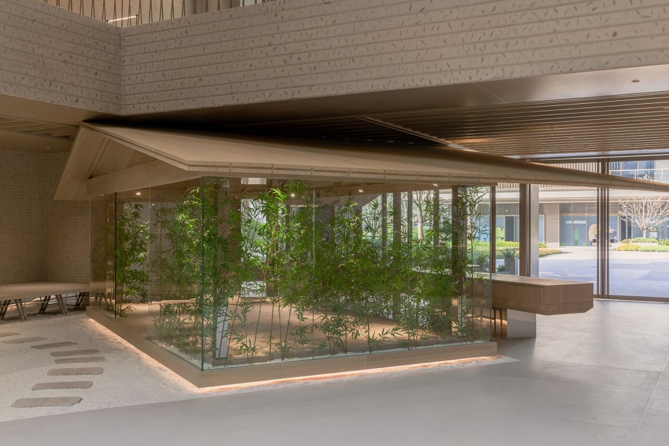 竹林玻璃房则是屋后的庭院,玻璃包裹和木质的屋顶,以小见大的设计,让人感受心怀自然,体会鸟鸣山更幽的禅意,作为全开放式大空间里的小盒子,也给私密交谈的需求场合提供了一个亲密丰沛的新场景,带来梦幻、安静、快乐以及松弛自由的状态。