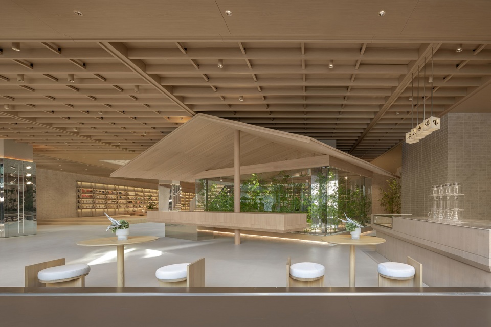 The wooden house with a sloping roof dominates the entrance’s visual focus. This small indoor architectural feature draws inspiration from the “home of childhood,” evoking scenes of life from years past. The simple form of the house instantly creates a sense of emotional belonging. Throughout the space, triangular slopes reminiscent of sloping roofs are subtly hidden, preserving the memory and charm of rural life through thoughtful design. These elements also add a warm, enveloping feeling to the space, making it both nostalgic and inviting.