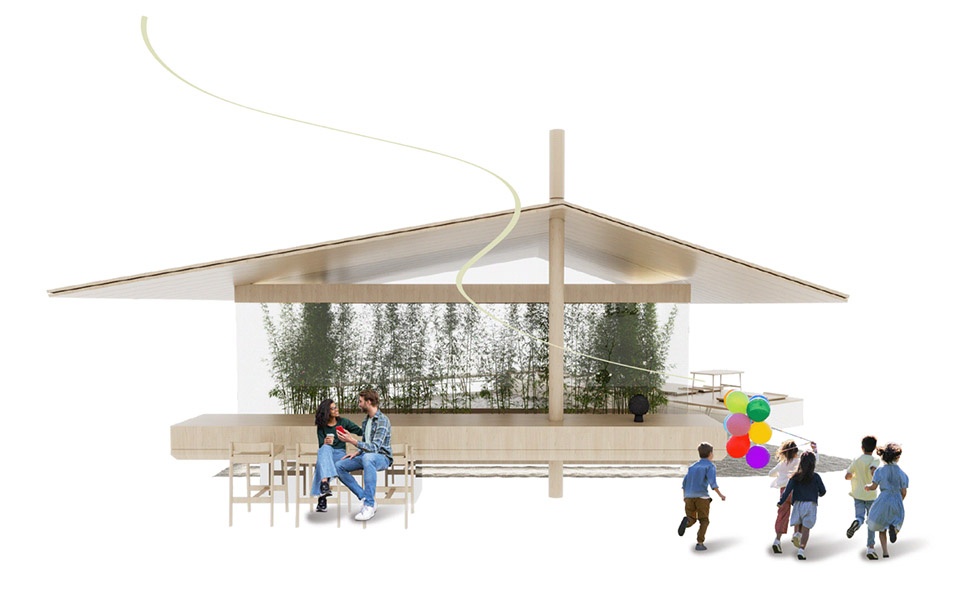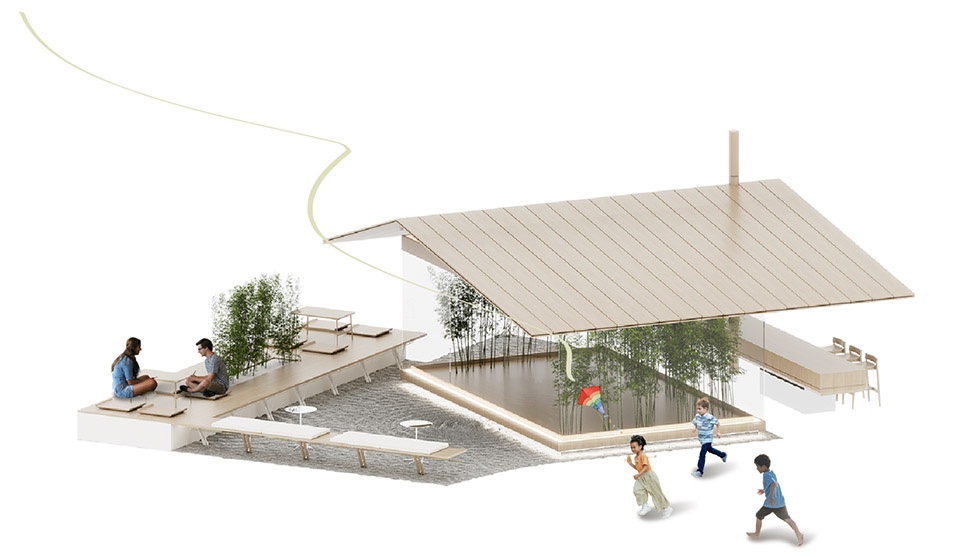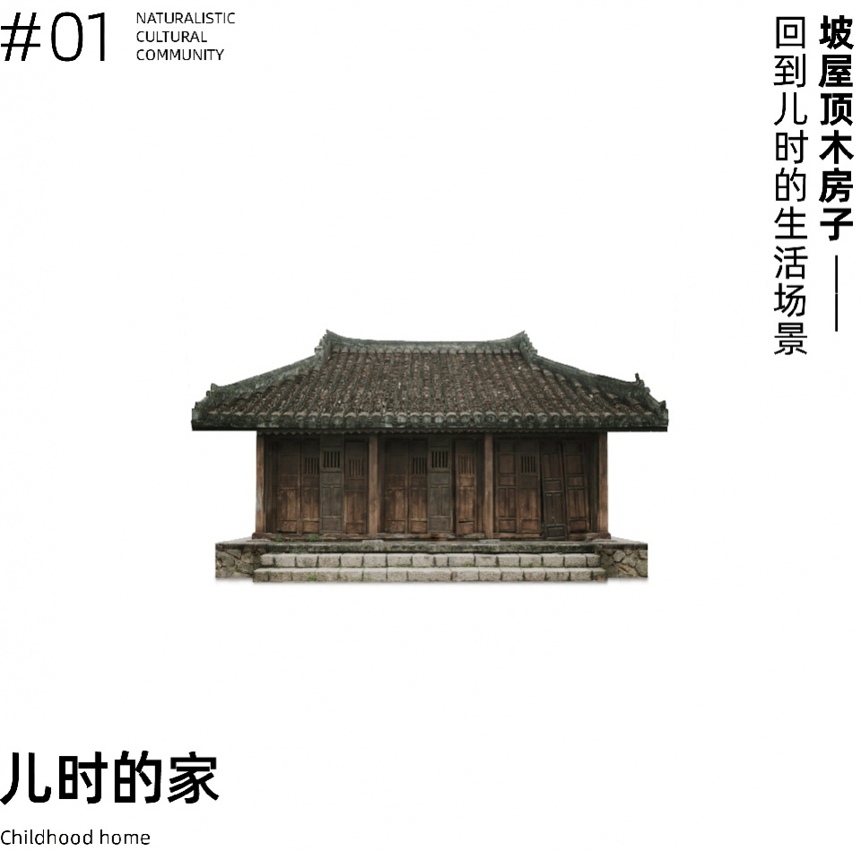 ▼坡屋顶的木房子占据着入口的视觉焦点,the wooden house with a sloping roof dominates the entrance’s visual focus