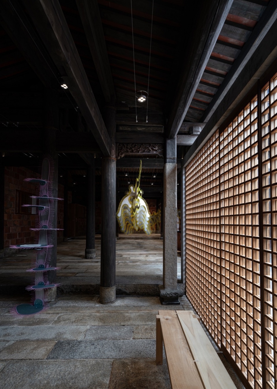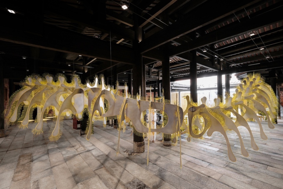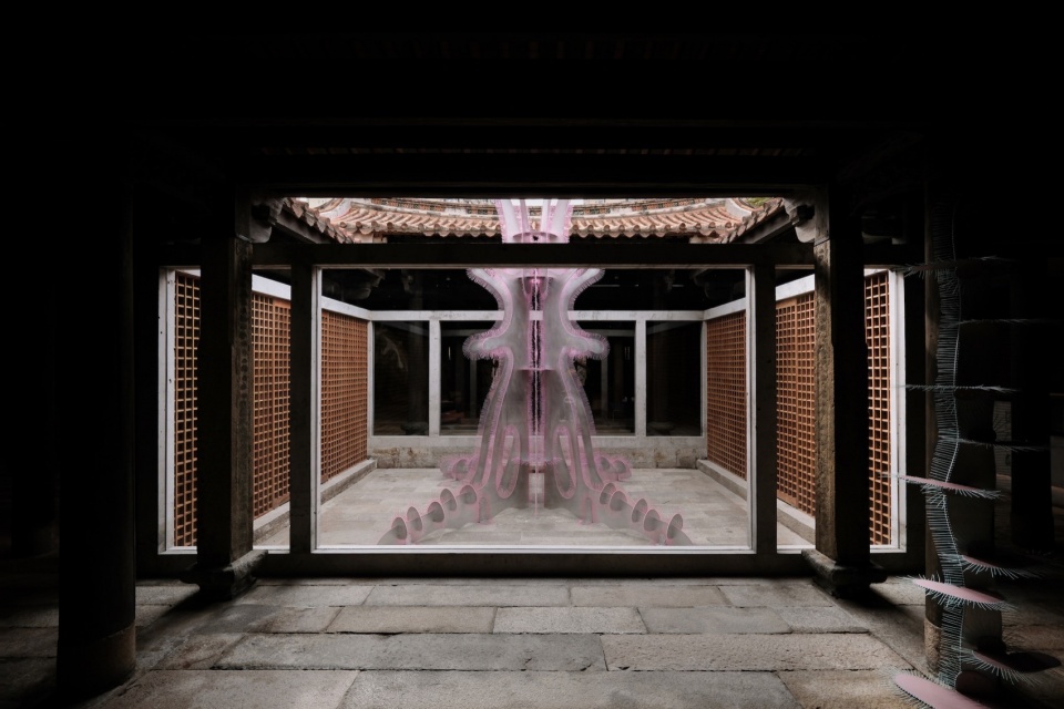 同时,在这个LANLANLI,我们希望艺术是被用来解析这个独特的空间,不是仅将空间作为容器,而是和空间发生关系。因此它区别于一般展览,DEVOLUTION退化建筑此次邀请了envy envy、File Studio和PAPAPAPARTNER三个小而有创造性的创作团队,在闽南大厝中创作了一件名叫“枢核”的作品,它是一个空间装置,破坏和重构了传统木结构建筑的制式感受,是这个闽南古建筑的一种新的情境生成。