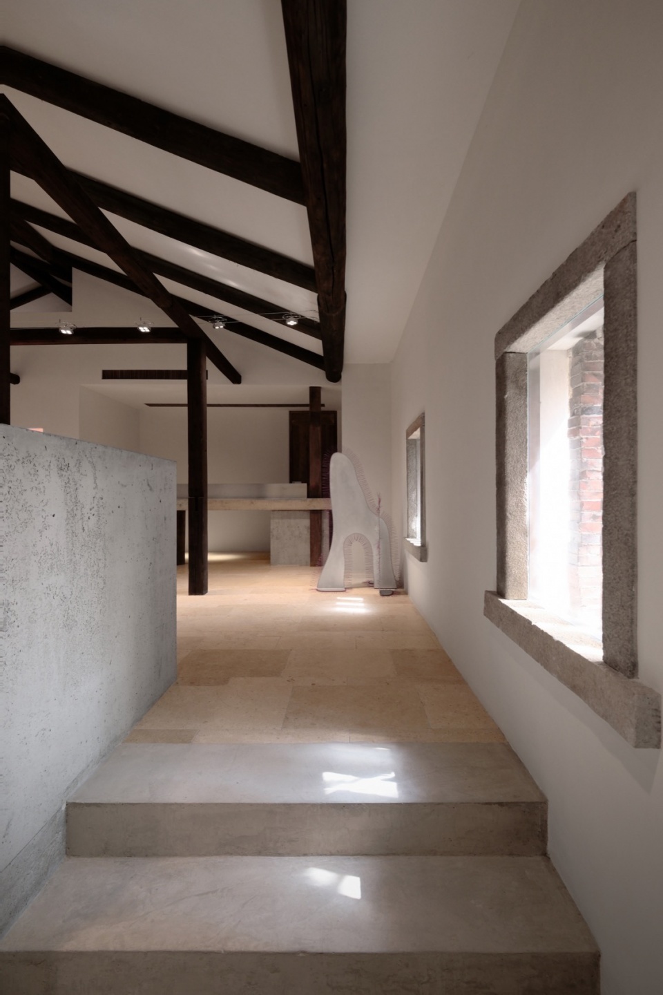 ▼混凝土体块和温润的野生柚木及泉州白石的拼贴,