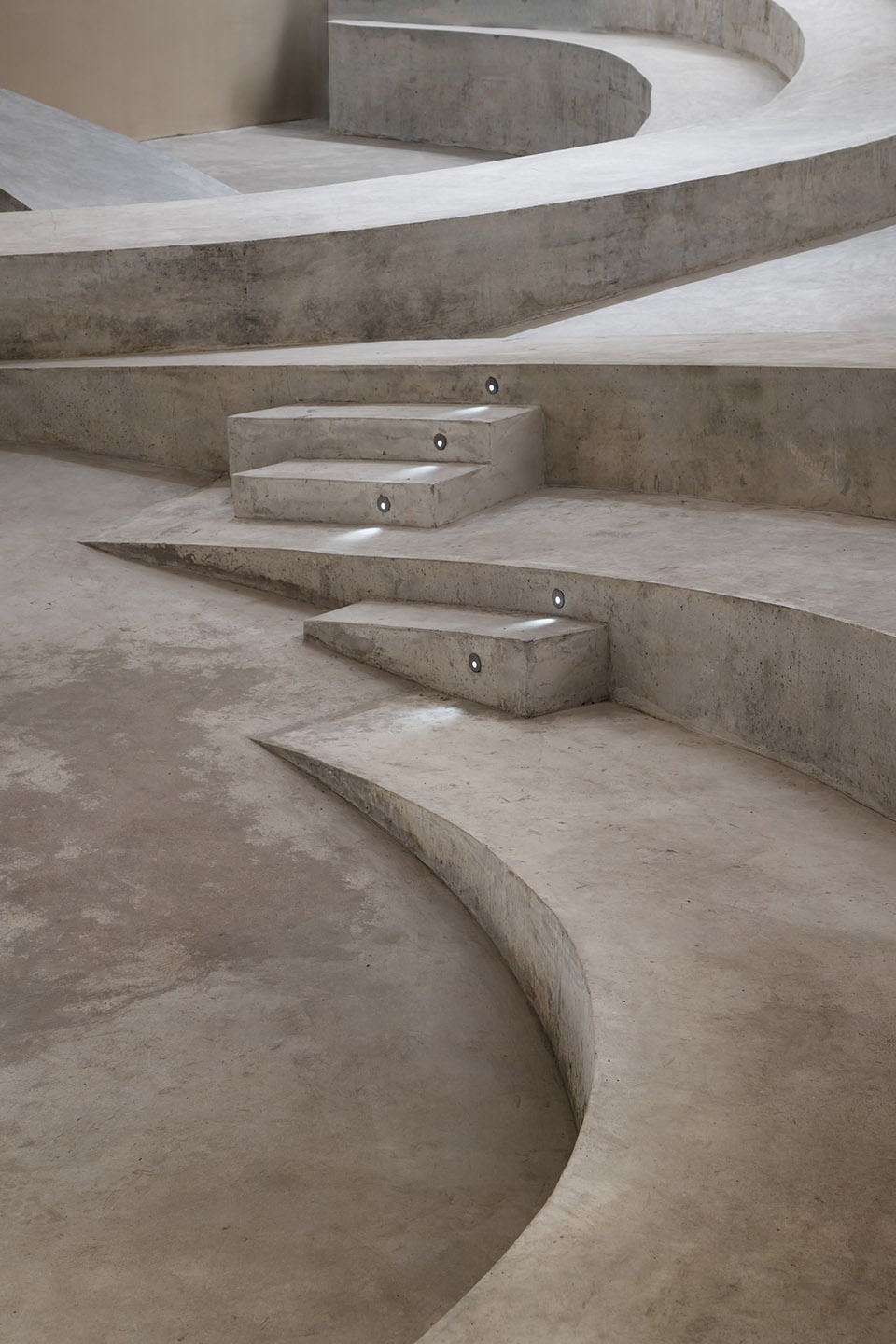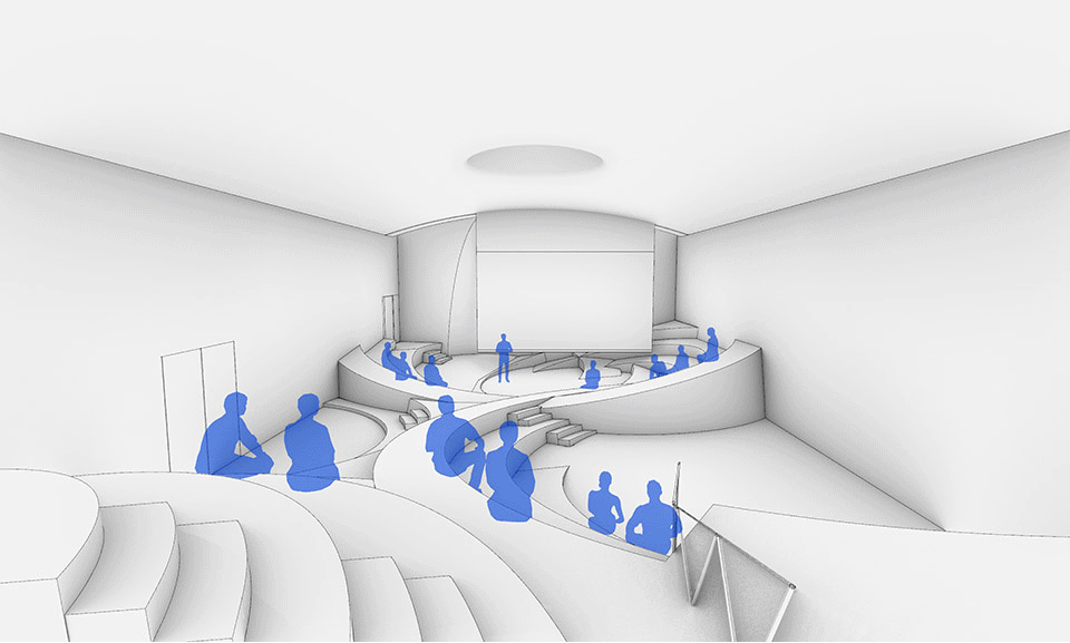 Today,training and sharing spaces are often arranged in stepped formations. Thus the interior is conceived as a kind of landscape, where steps merge movement and seating into a single, continuous topography. For SpActrum’s architects, this geometric approach adapts to various behavioural patterns, imbuing the space with an unprecedented sense of fluidity and continuity. While although it breaks down functional boundaries, it still maintaining a strong central focus and unified narrative power. In today’s society, there is a need for innovative prototypes that can adapt to and create multi-centred spaces where speakers and audiences merge, unlocking greater spatial potential and freedom.