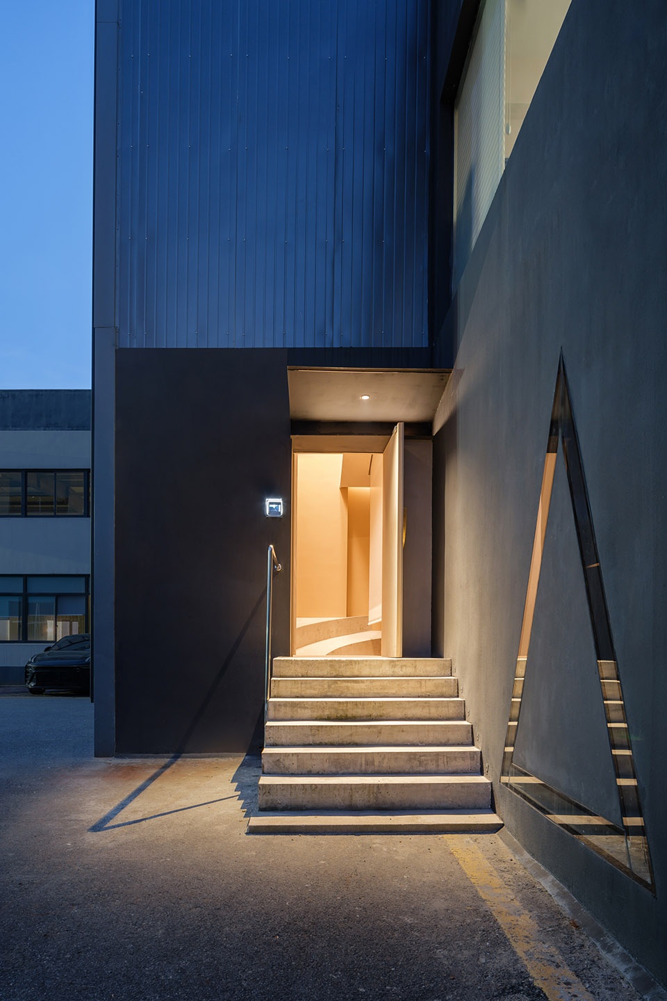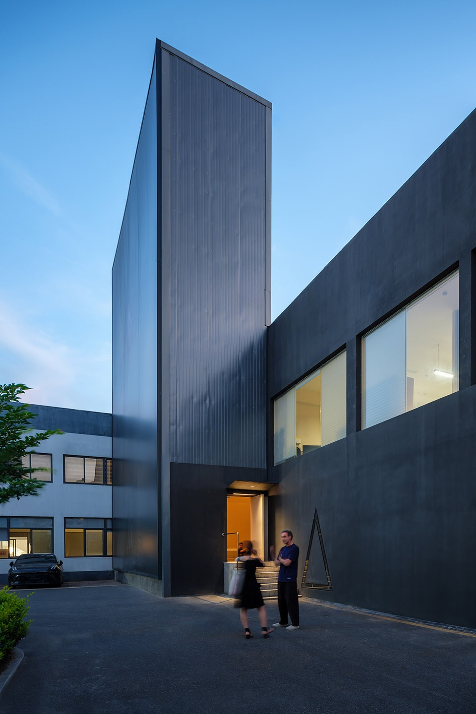 , serving those who gather in the area. Skylights are strategically placed in the higher front sections, along with a central circular skylight, to flood the space with natural light. In addition to its connection to the office spaces, the centre features a simple, direct entrance leading outdoors.
