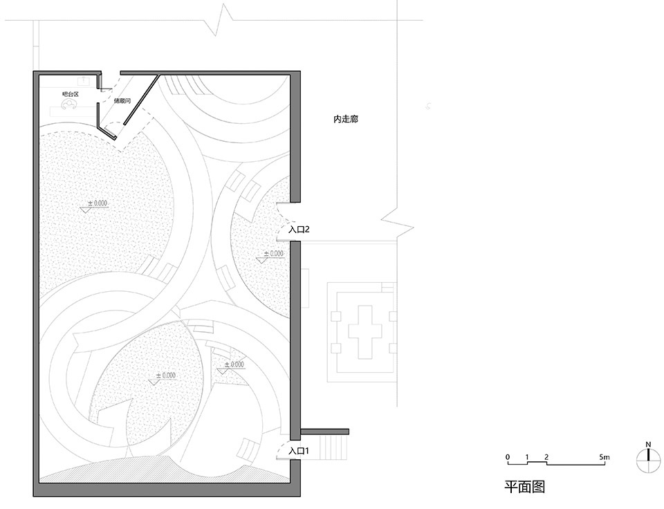 阶梯高度间隔和增减趋势,阶梯之间应该满足基本的人的坐高,同时降低行走的难度使台阶间隔高度不要太大。整个空间不再是一个统一的阶梯,但仍然应该具有后部高、前部低的总体趋势,使得空间也具有潜力,三圆合一,作为一个宣讲空间使用。所以,前两个同心圆圆心是低点,而后部的同心圆圆心是高点。这也强化了“地形”、“山坡”这样的景观意向。