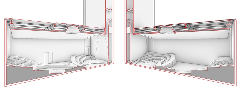 室内空间在此被理解为一种景观。培训空间或分享空间在今天常以阶梯的方式出现。这种梯阶将行走和坐观融合在同样的地景中。对于谱观的建筑师来说,这种形式以同样的几何处理适应了不同的行为模式,赋予空间前所未有的松弛和连续,打破了功能的界限,但仍是中心性强烈和话语权力统一的产物。当今的社会,需要创新的原型以适应和创造多中心的、讲述者与观众合一的空间场域,以释放更多的空间潜力,达成更大的空间自由。