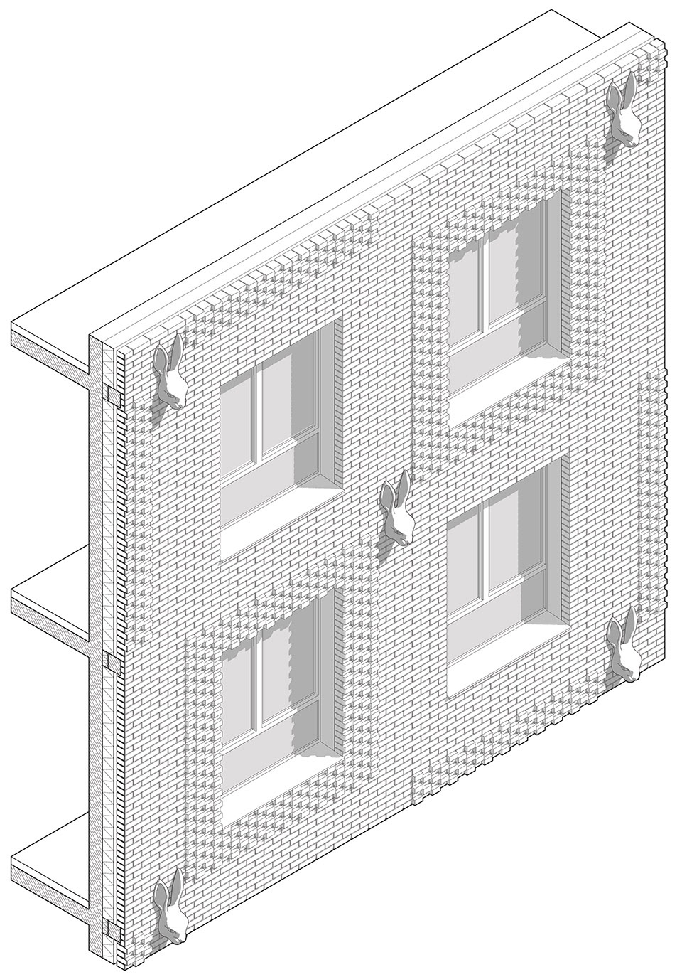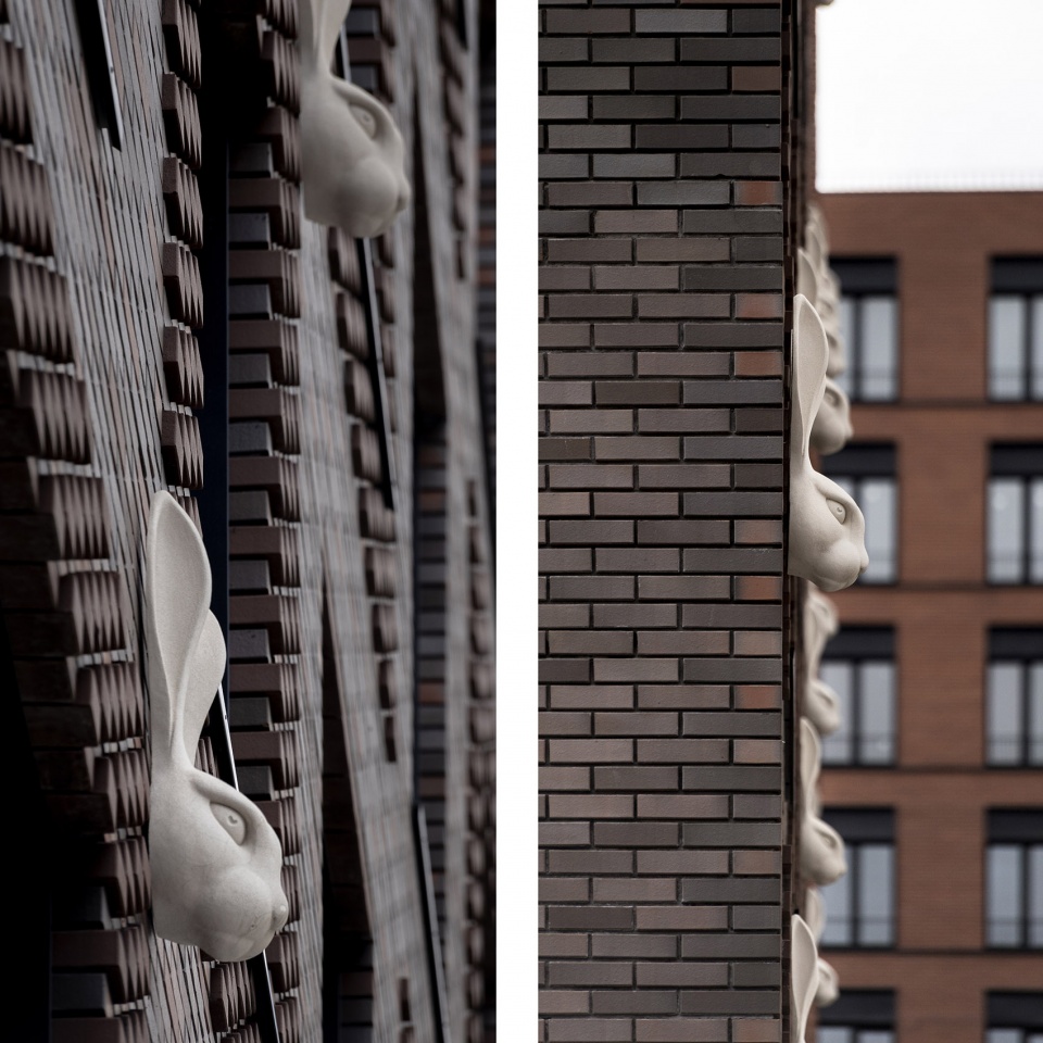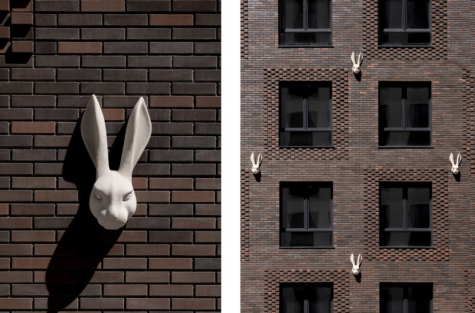 ▼红砖外立面上的白色兔子面具,Hare mascaron’s sturdy face on the red brick facade