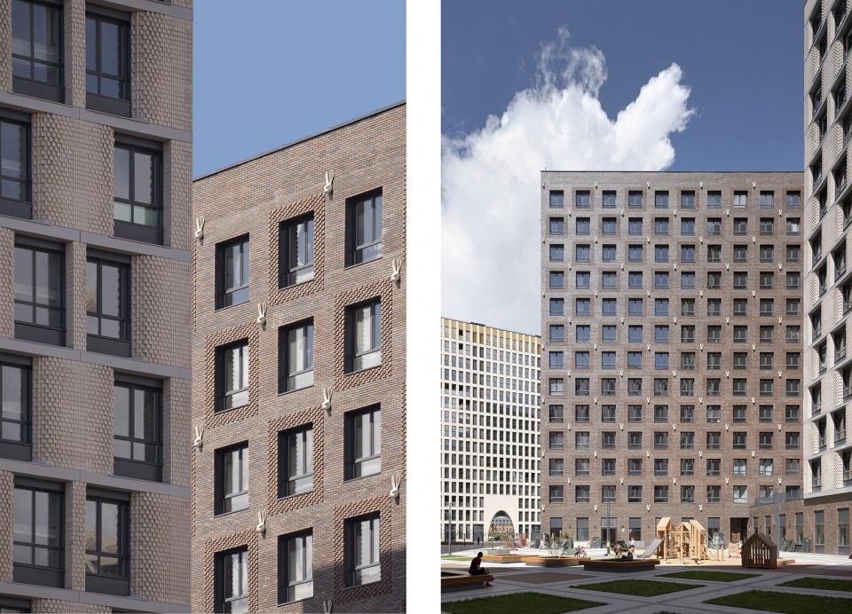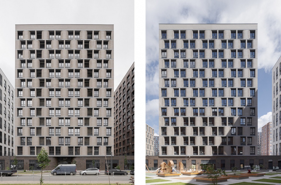 外立面是混凝土包层带和Cuuber砖外立面系统的组合,布局经过精心设计棕色塔楼的窗户周围有突出的单砖框架,打断了平砖错缝。白色塔楼的窗间墙有凹形的水平挑布局。12号地块有一个地下车库和一个私人庭院。入口来自相邻的街道,一个门厅供两个步行道使用。塔楼每座有12层,采用现浇混凝土建造。每座塔楼由两个步行楼梯组成每层有4到6套公寓。公寓的平均面积符合莫斯科市场的标准,一室公寓40-45平方米,两室公寓50-0平方米,配有独立厨房。