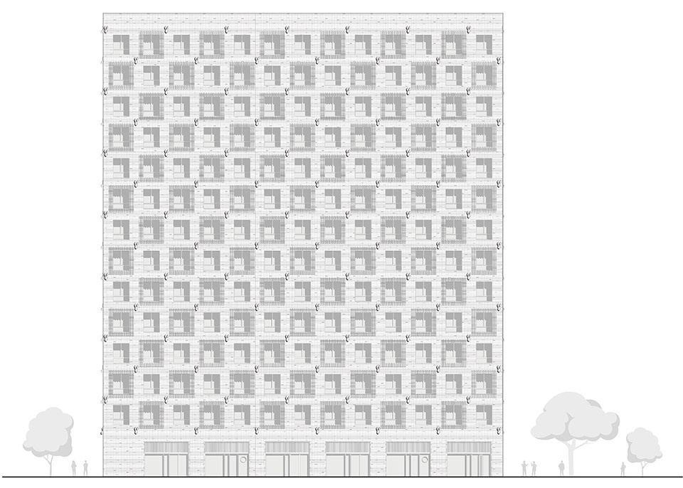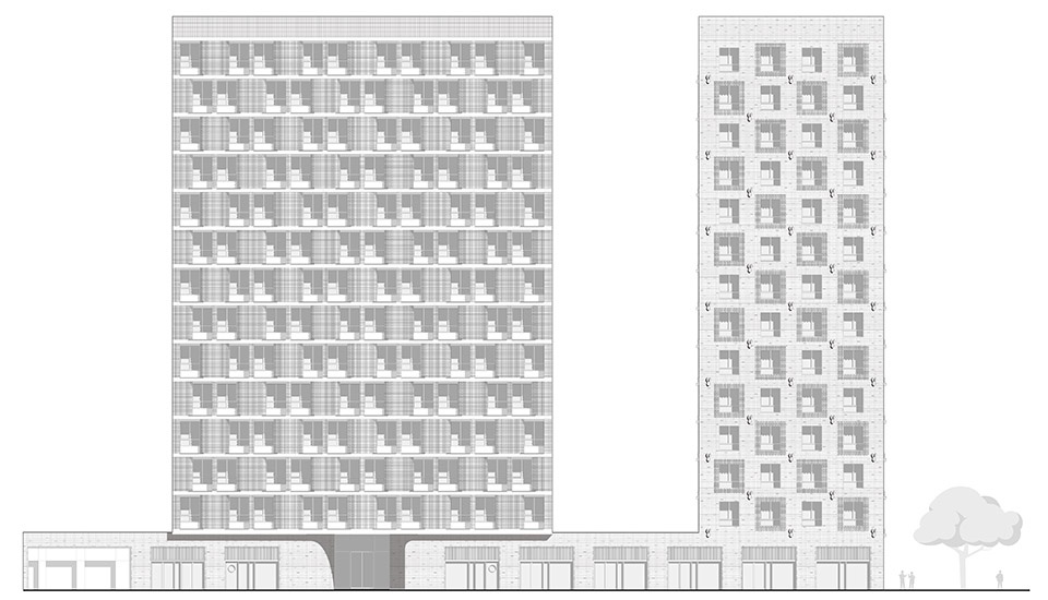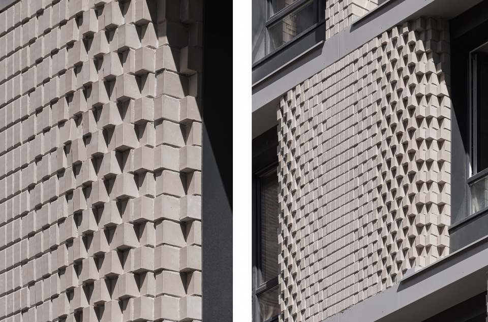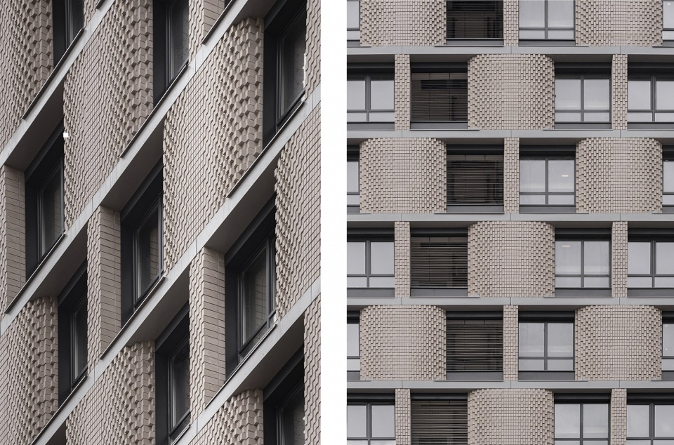 Façade is a combination of concrete cladded bands and Cuuber brick façade system, with carefully detailed layout.Brown tower has protruding singular bricks frame around windows interrupting the stretcher bond. The white tower has a concave shaped horizontal corbelling layout of the inter-fenestrations.