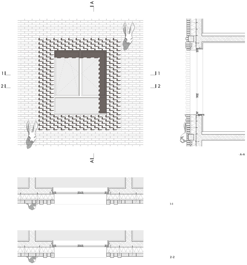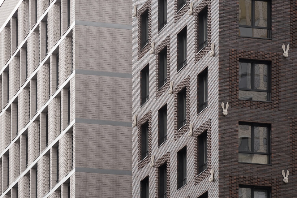 第一座房子由深棕色砖块制成,带有白色的兔子面具,这一细节使其在周围环境中脱颖而出。建筑立面上的面具一直用来创造多样性和识别度。